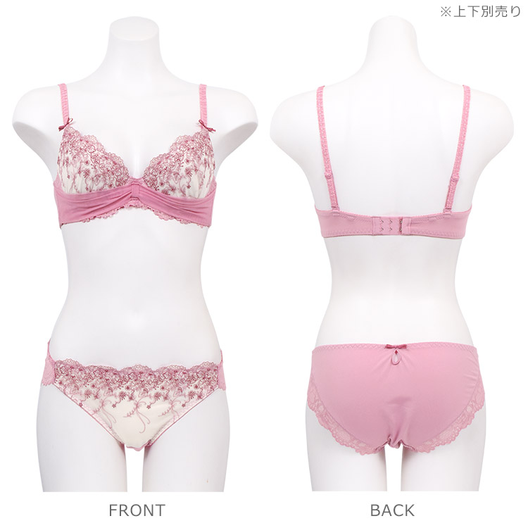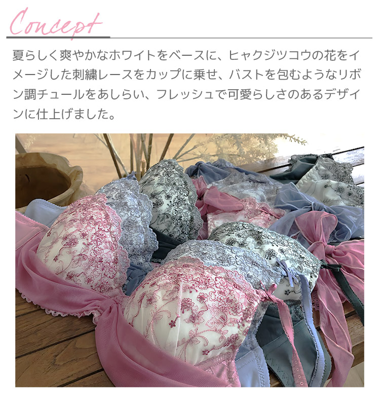 2色の糸と、細やかな柄がとても繊細で上品なデザインに、バストを包むようなリボン調のチュールが可愛らしさをプラス。