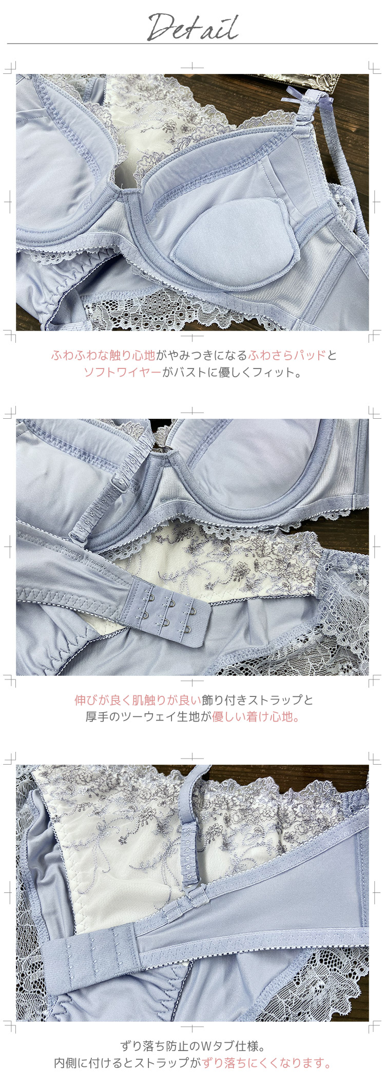 カップ裏とバック布はさらりとした手触りのツーウェイストレッチ素材。