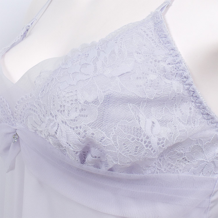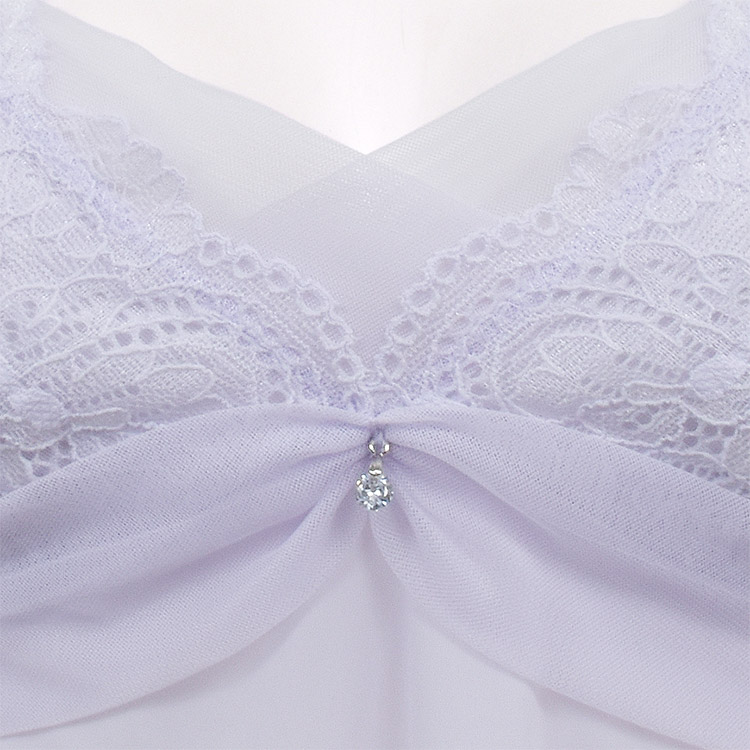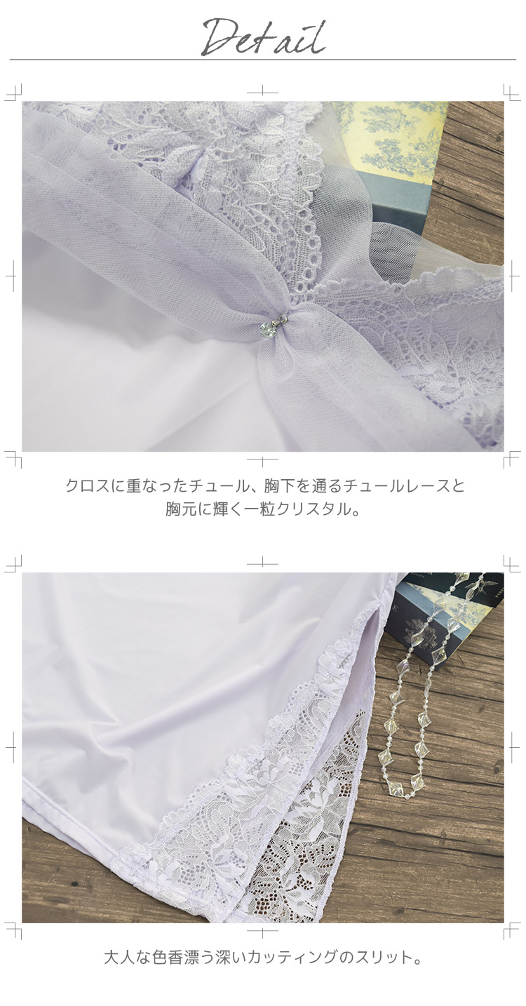 クロスに重なったフロントチュール、胸下を通るチュールレース、胸元に輝く一粒クリスタル、腰まで届くかのような深いカッティングのスリット等、しっとりとした大人な色香漂うデザイン。