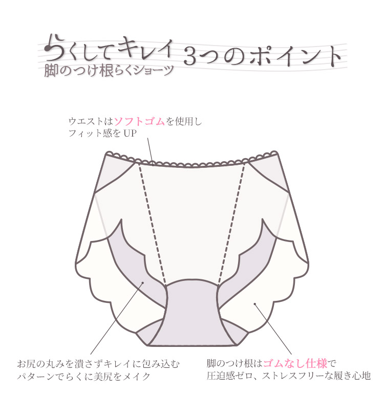 1)脚の付け根はゴムなし仕様で圧迫感ゼロ。鼠径部の圧迫がないのでらくちんな履き心地