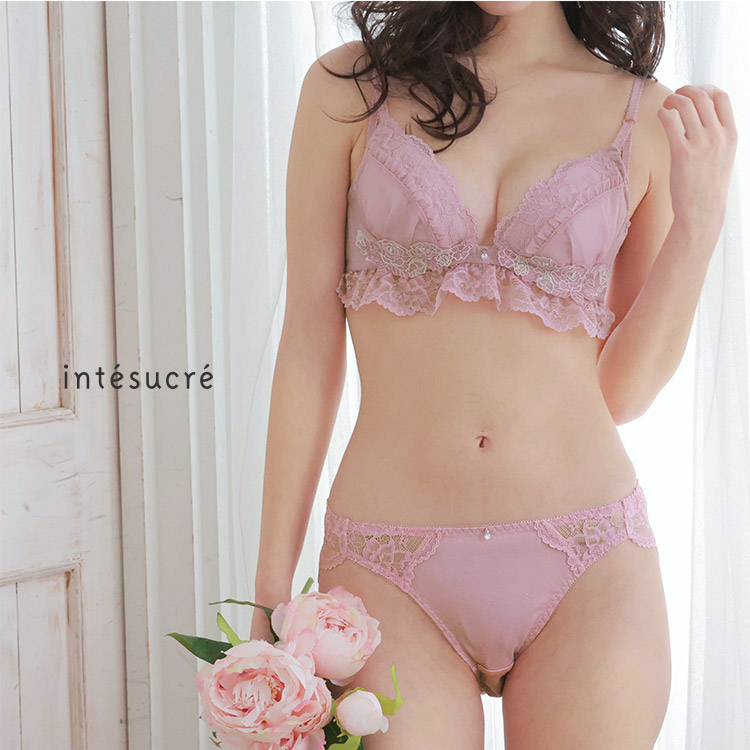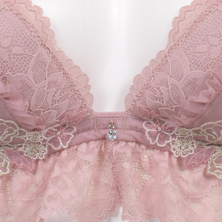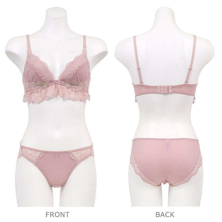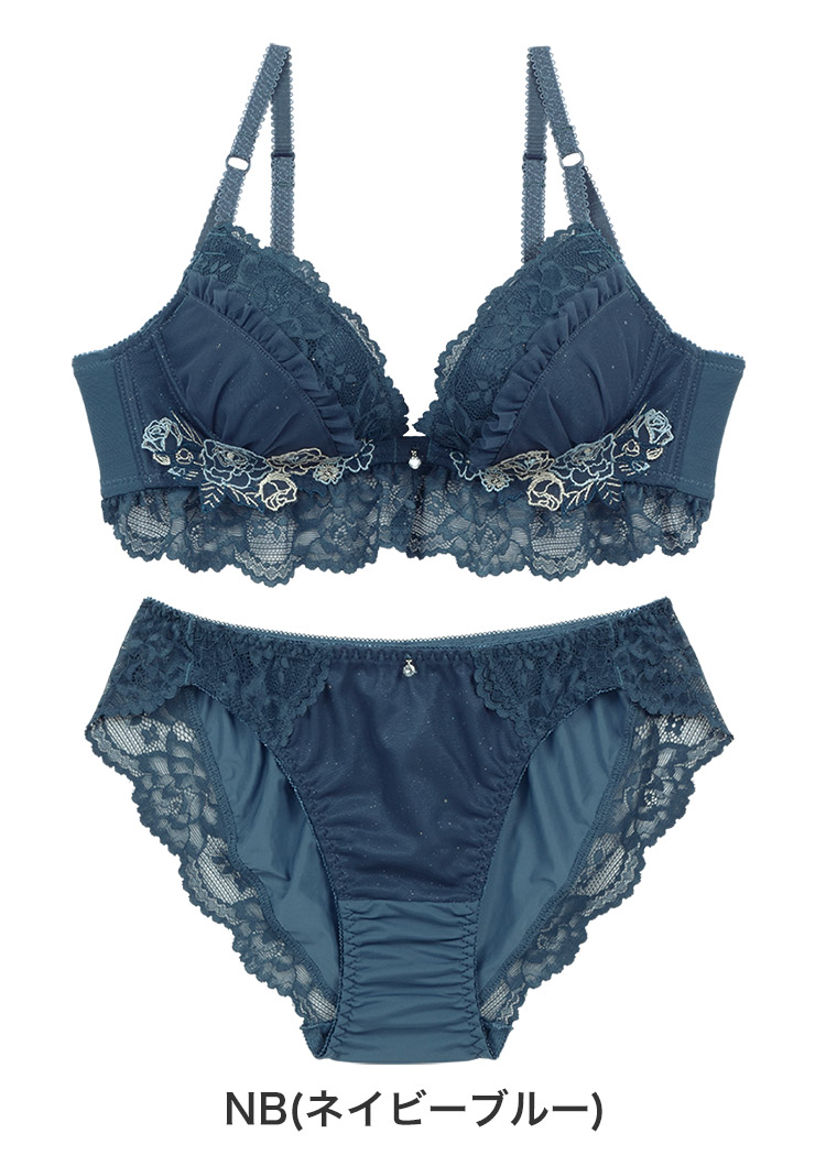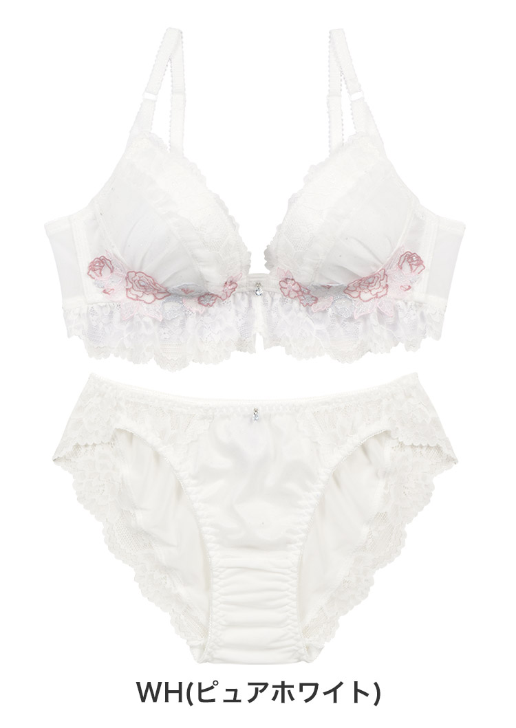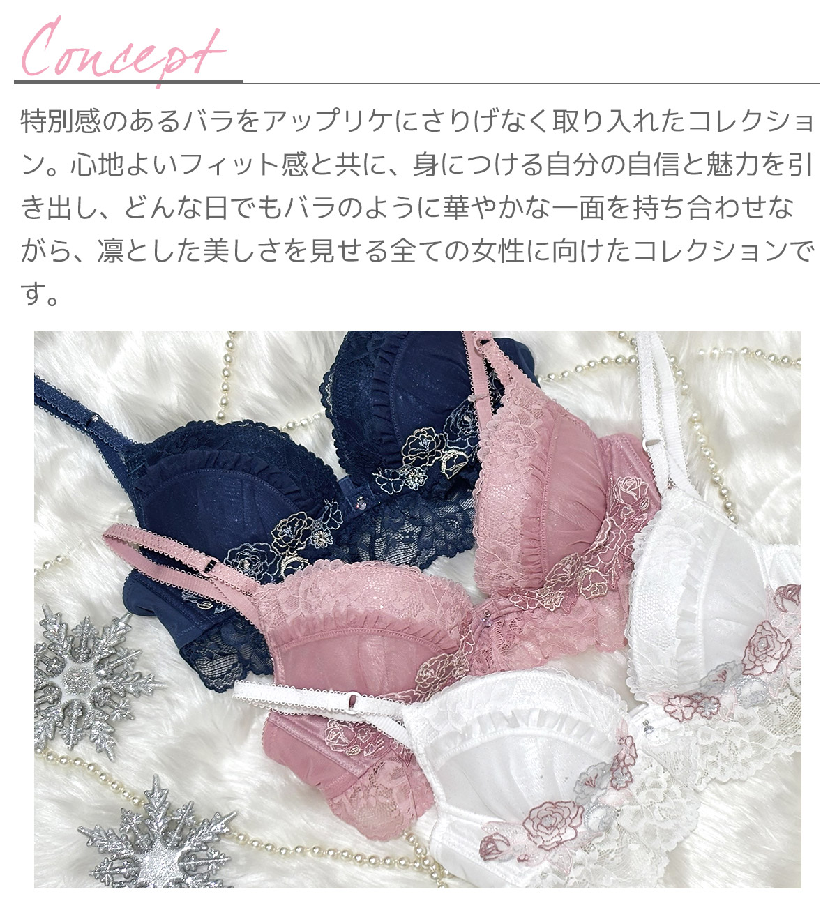 ラメ糸を使用した様々なバラのアップリケをカップを包み込むように配置。たっぷり使用したストレッチレースやフリルのディテールは女性の甘い色香をイメージしています。