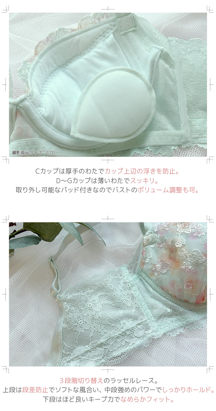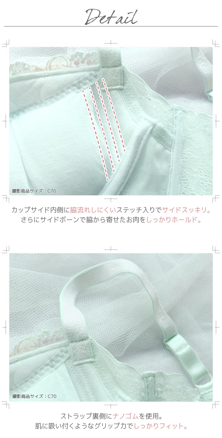 Cカップは厚手のわたでボリュームUPと上辺の浮きを防止、D~Gカップは薄手のわたですっきり。脇流れ防止の千鳥ステッチ入り。