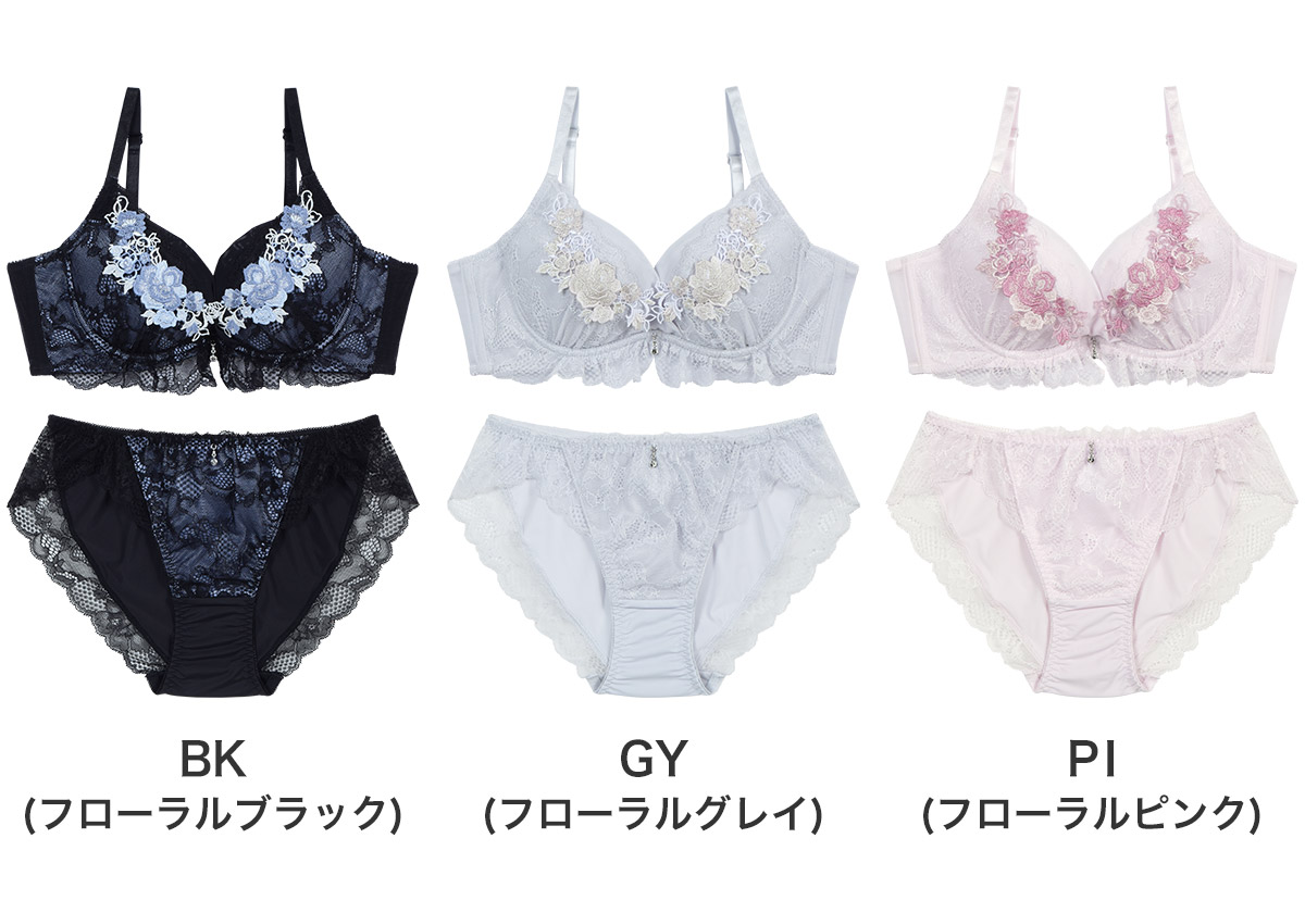BK(フローラルブラック)、GY(フローラルグレイ)、PI(フローラルピンク)