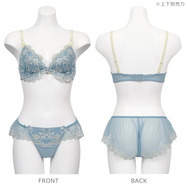 刺繍レースをたっぷり使用した豪華なアイテム。フロントサイドのリボンも可愛らしいポイント。