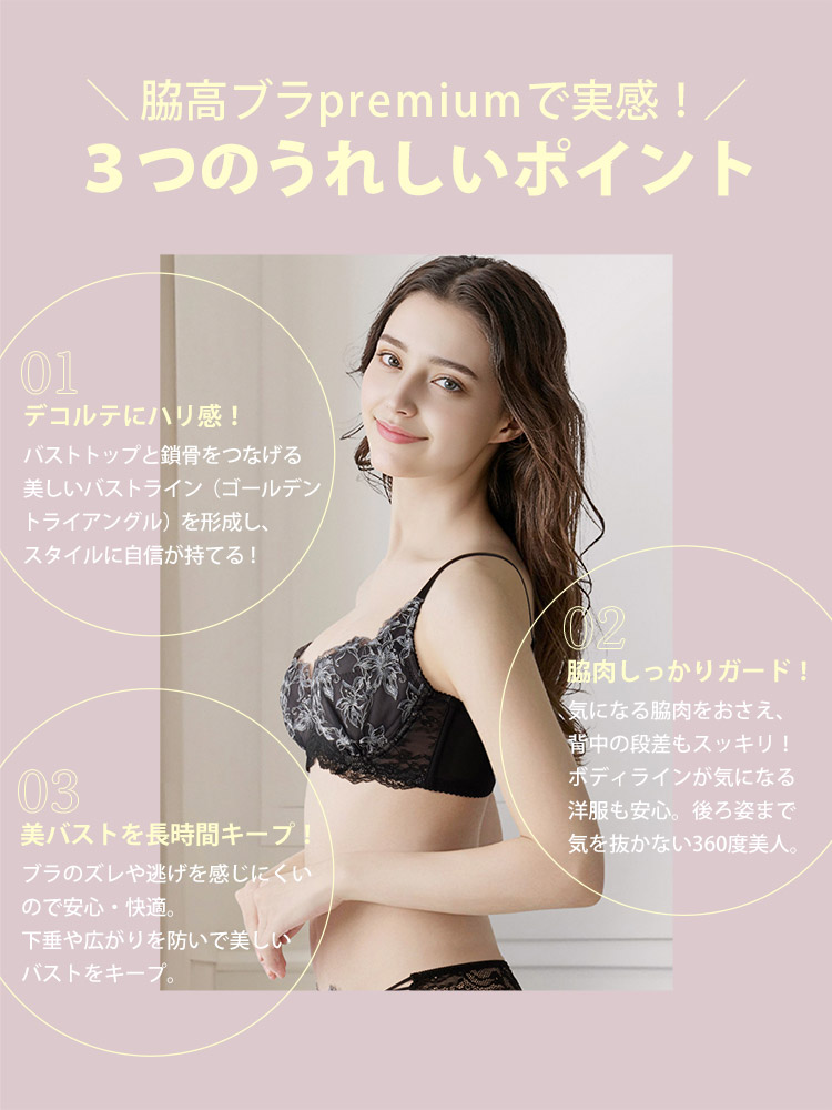 脇高設定でキャッチしたバストを外に逃さない、ずっと続くホールド感と美デコルテライン。