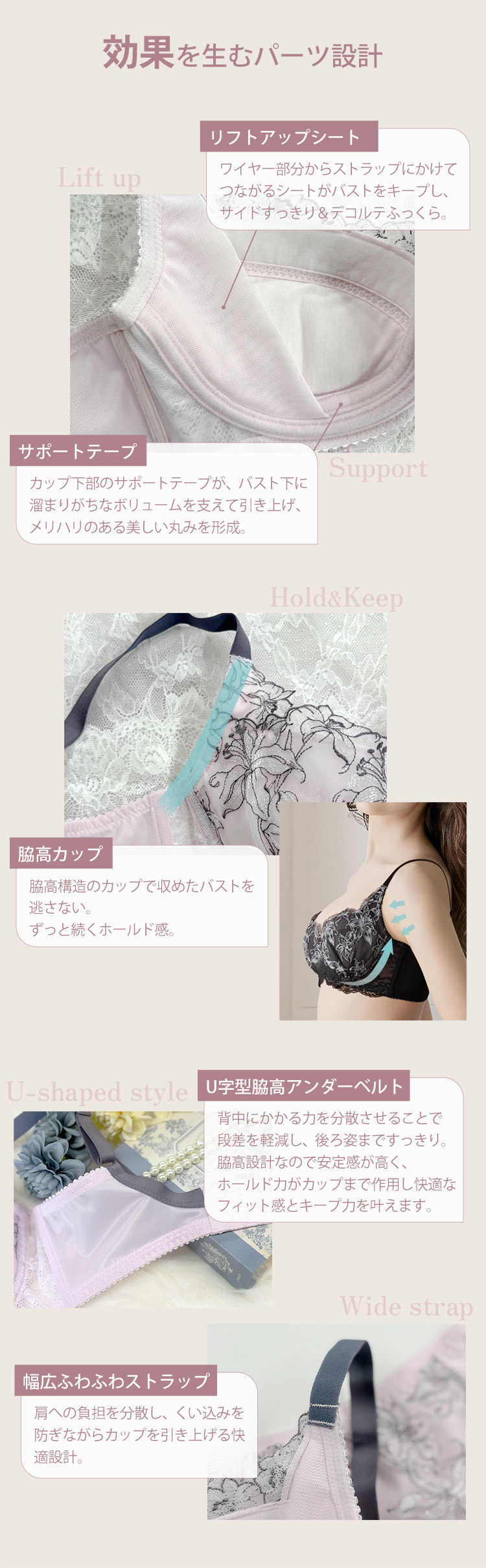 カップ裏のリフトアップシートの引き上げパワーをアップし、サポートテープをプラスすることで、バスト下に溜まりがちなボリュームをバスト上部へ綺麗にアップし、高さのある自然で綺麗なデコルテふっくらバストをメイク。