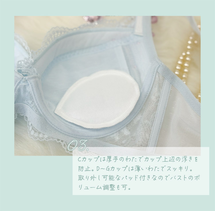 Cカップは厚手のわたでボリュームUPと上辺の浮きを防止、D~Gカップは薄手のわたですっきり。脇流れ防止の千鳥ステッチ入り。