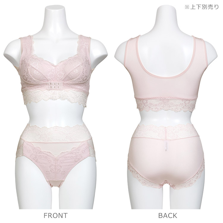 楽な着け心地ながら、脇高設計で安心のホールド感。フロントホックの仕様で、バストを内側に寄せます。