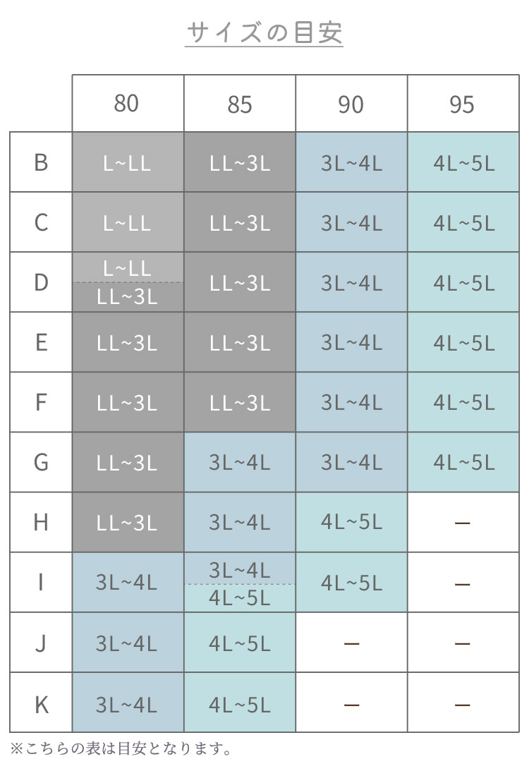 3L-4L:アンダー80-90cm、バスト100-115cm
