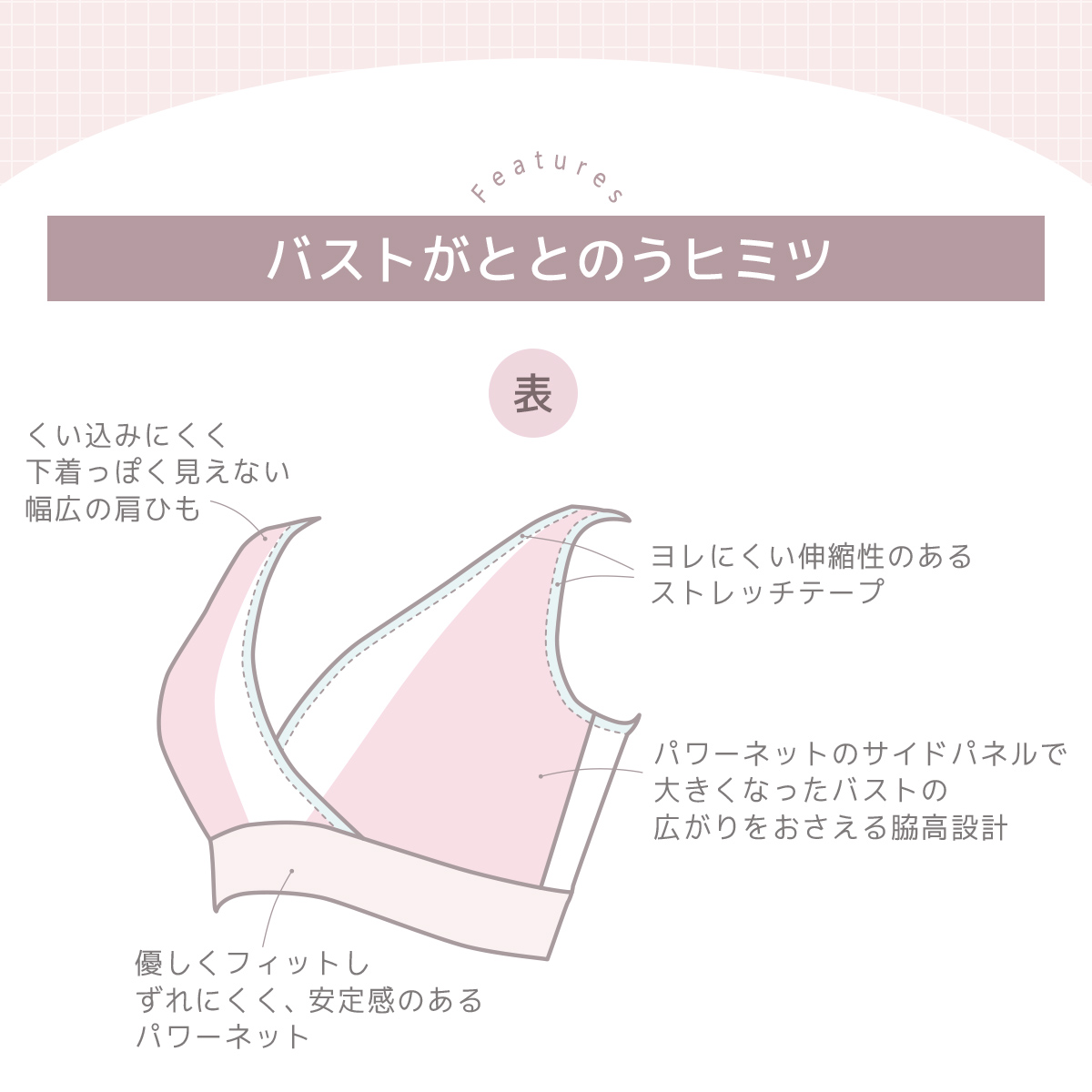 前身頃とあて布の間に挟み込んだパワーネットのサイドパネルがバストの広がりを押さえてボリュームのあるバストを支えます。(※)