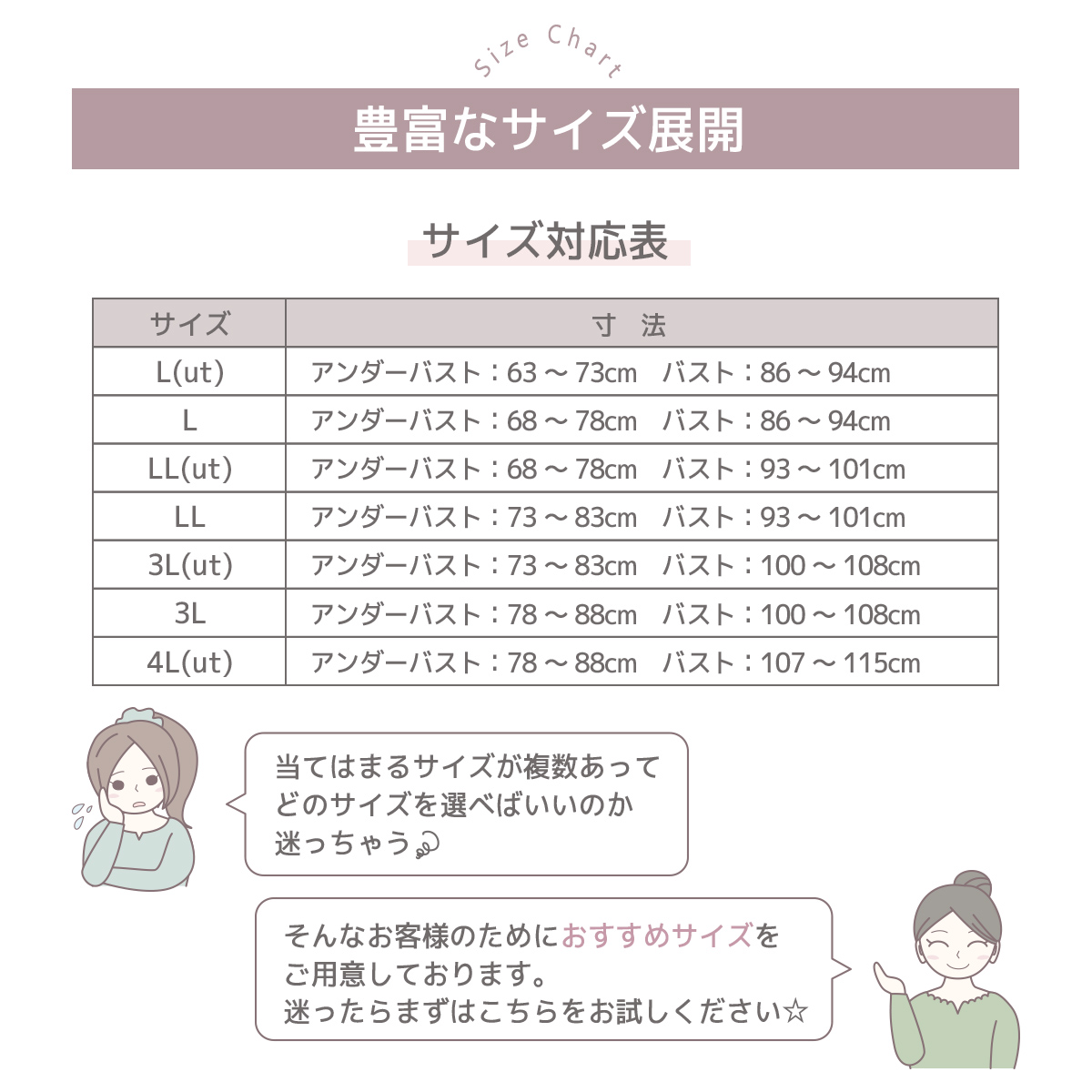 | 3L(ut) | :アンダー73-83cm、バスト100-108cm |