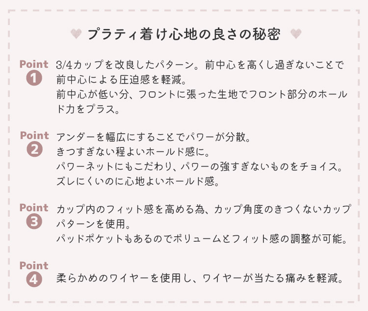 カップ内のフィット感を高める為、カップ角度のきつくないカップパターンを使用。