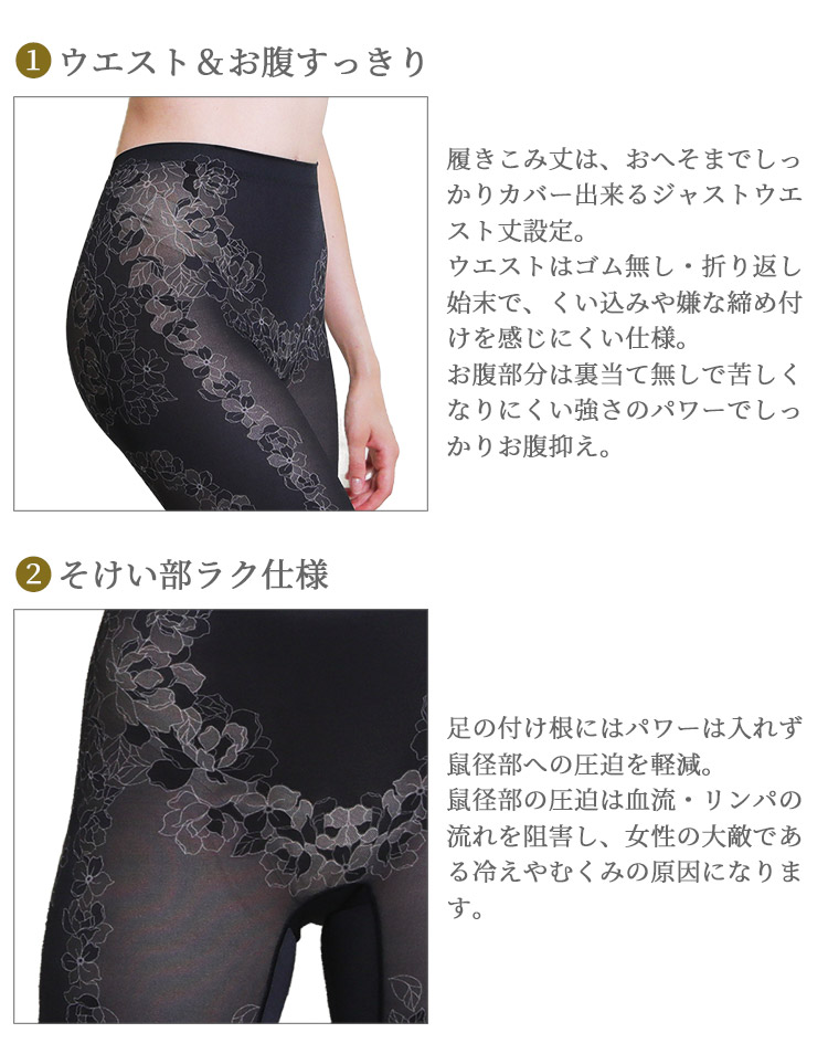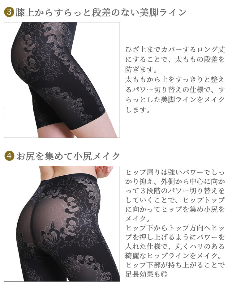 さらに膝上のロング丈仕様で、太ももから上をすっきりと整えるパワー切り替えの仕様になっている為、すらっとした美脚ラインをメイクします。