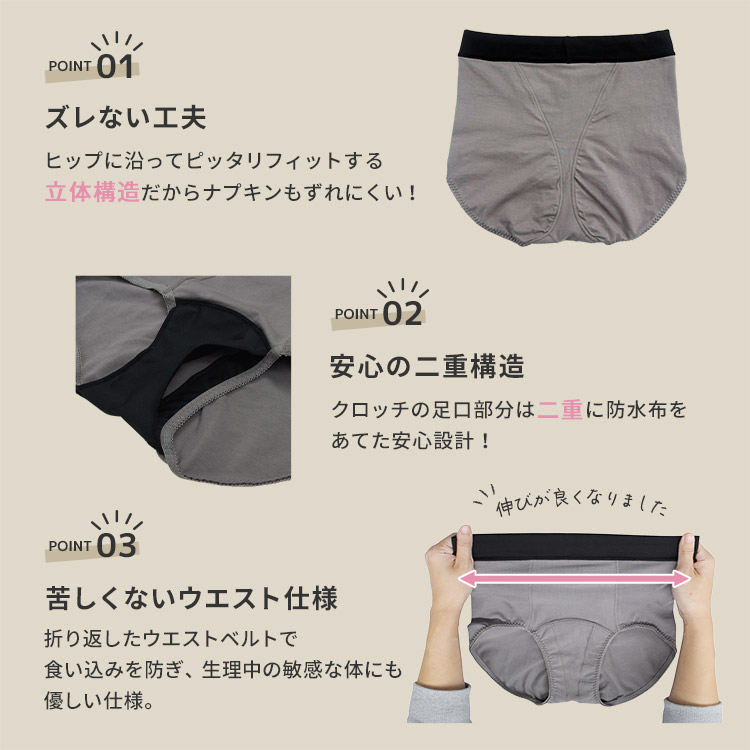 関連キーワード:アンテシュクレ 生理用 モレない 響きにくい 深ばき 股上深め はきこみ深め 段差が出にくい おしりすっぽり
