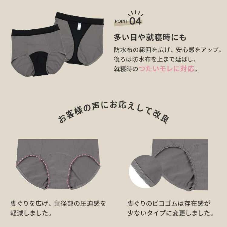 | 後ろはウエストベルトまで防水布を広げつたいモレに対応 立体構造でナプキンがズレにくく、まあるいヒップをメイク |