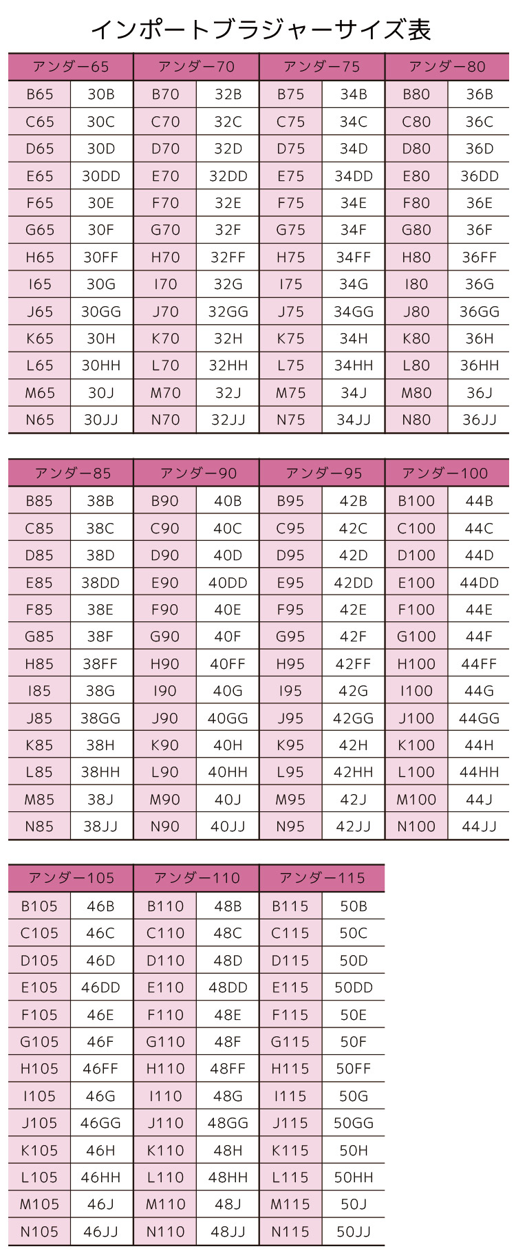 30GG (J65相当)、32GG (J70相当)、34GG (J75相当)、36GG (J80相当)、38GG (J85相当)