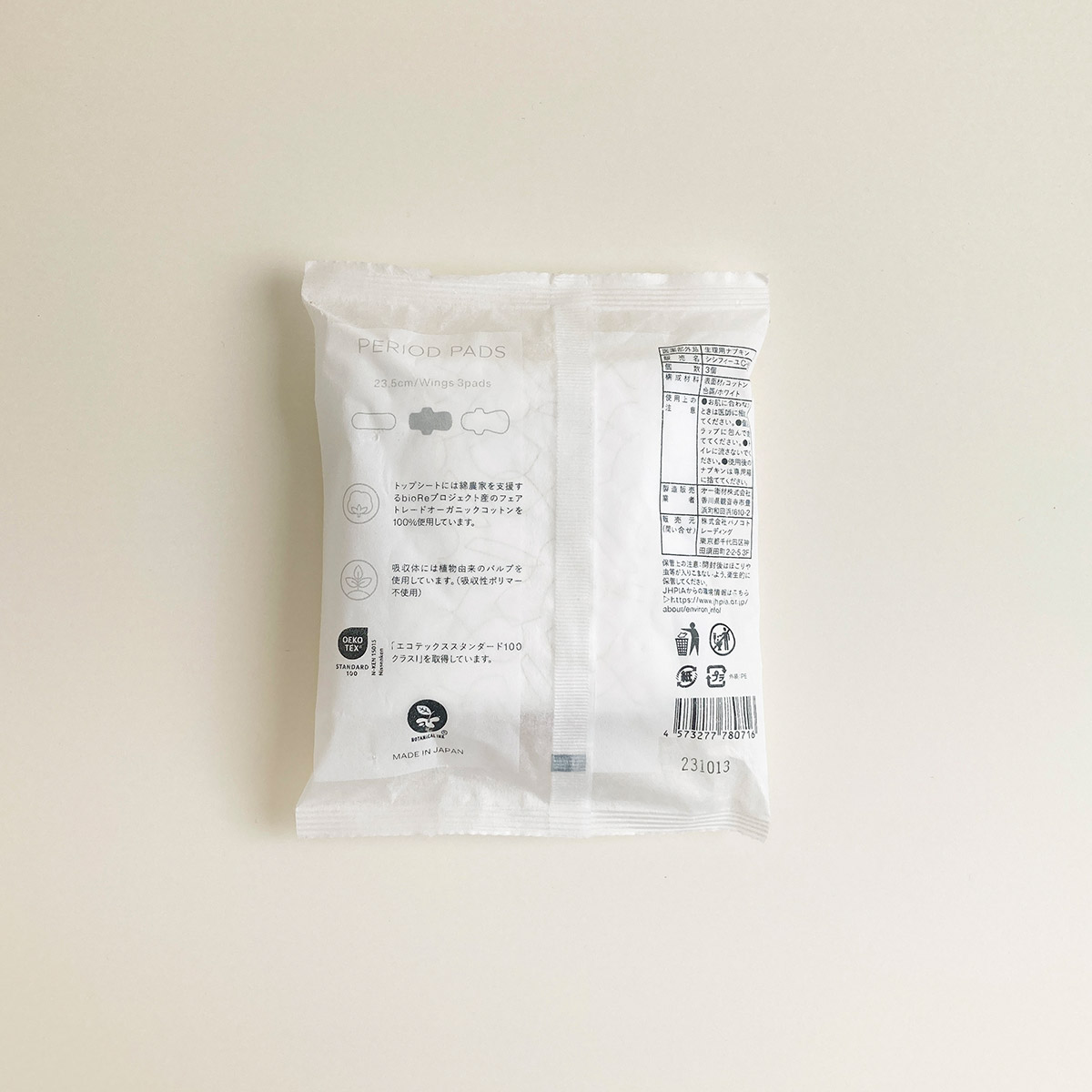 直接肌に触れるトップシートは自社で輸入したフェアトレードのオーガニックコットン100%、吸収体には植物由来のパルプを使用。日本国内(香川県)で製造しています。