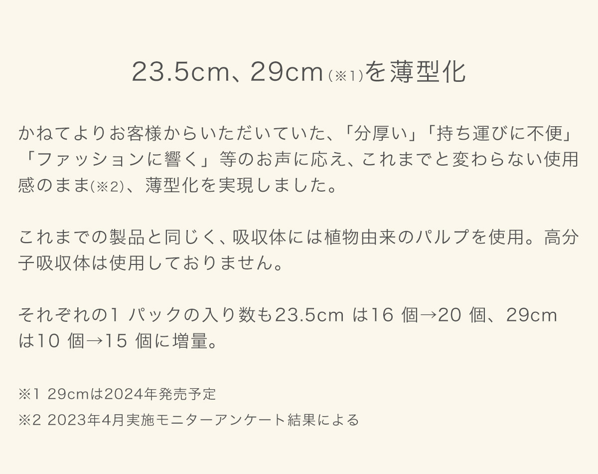 経血の量が少ない日にも多い日にも使える万能タイプ。羽つきでしっかり固定でき、横モレの心配もありません。