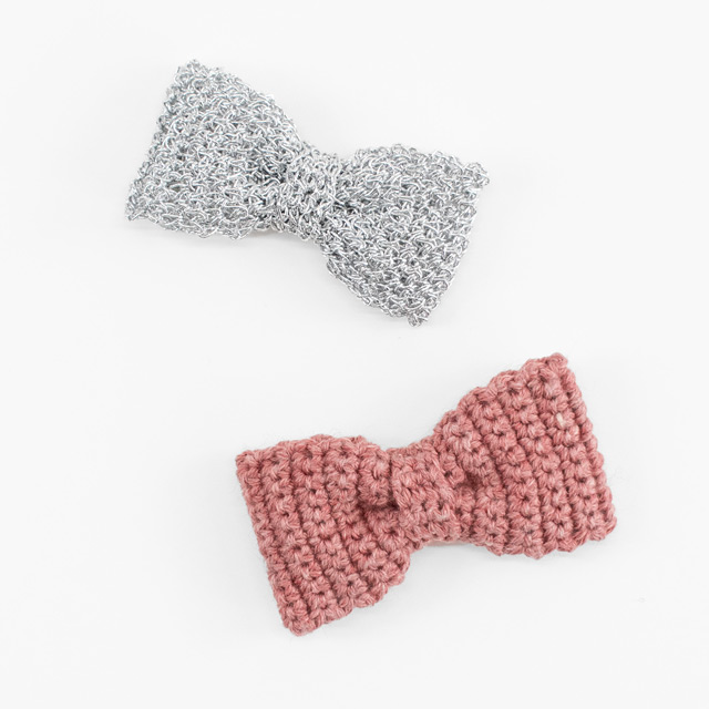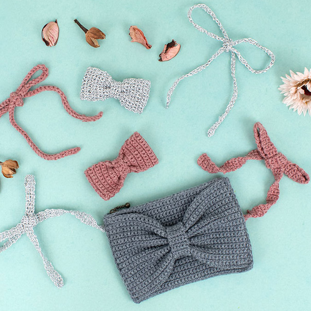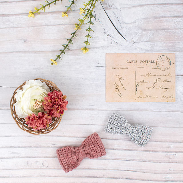 タイのようなリボンのモチーフ。ゴムやピンをつけてヘアアクセサリーやチャームなどに!手編みのバッグなどに留めつけてもかわいいです。目数、段数が少ないので、編み物はじめてさんでも短時間で仕上がりますよ。