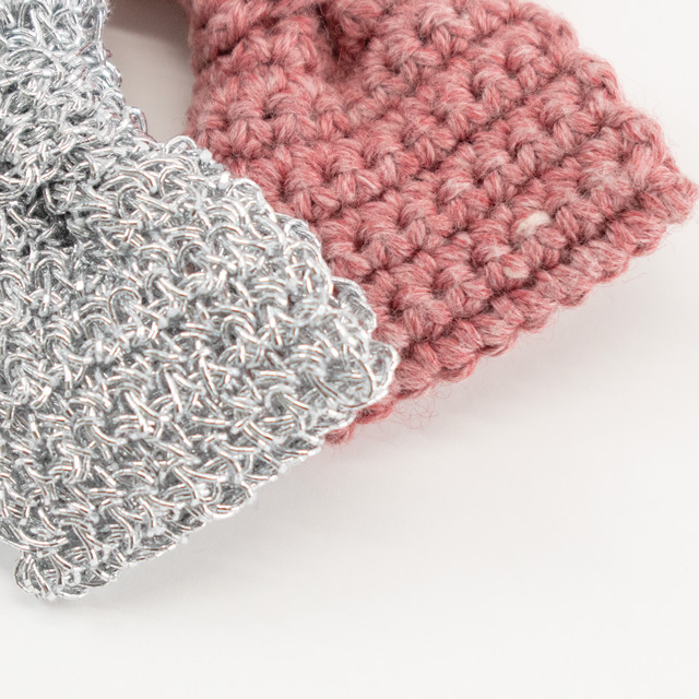 Daily キャトル/40g巻 色番3.ローズピンク使用量:7g(0.2玉)メタリックプレイコード/70g巻ド 色番101.シルバー使用量:6g(0.2玉)
