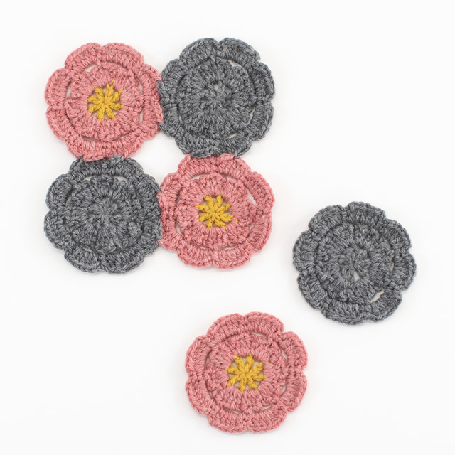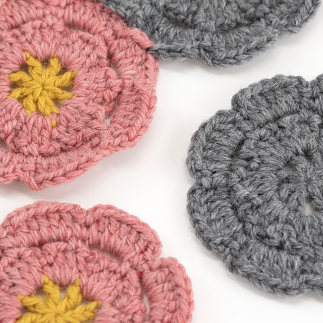 1枚でも、つなげてもかわいいお花のモチーフ。くさり編み、細編み、長編み、3つの編み方でお花を編んでいきます。それぞれの編み目の大きさを揃えることできれいなお花の形になりますよ。