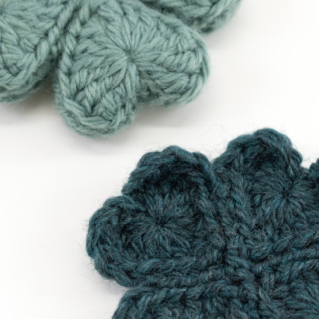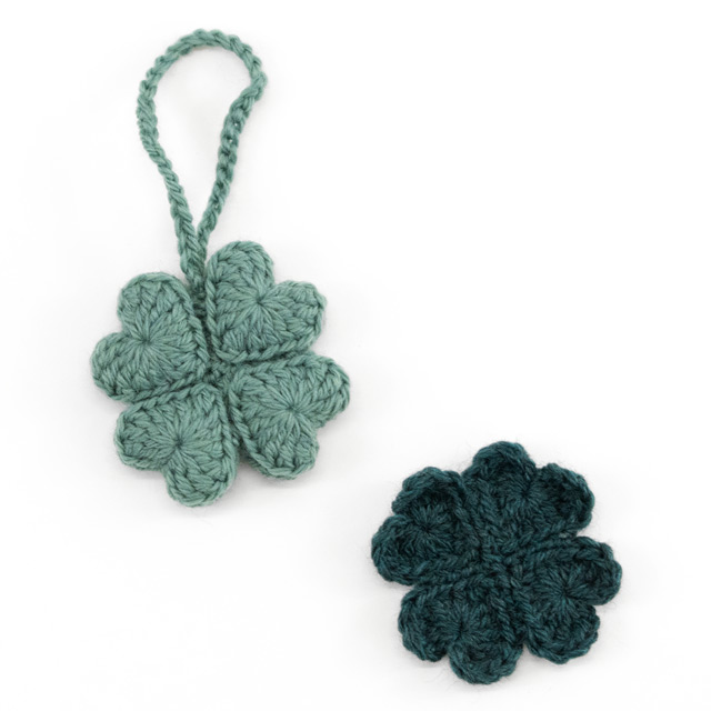 クロバーのぺたんこモチーフと、厚みのあるチャーム。ハートのモチーフ編んでを4枚組み合わせるとクローバーのモチーフに。8枚編んで、2枚を重ねて巻きはぎすると厚みのあるクローバーができます!コードをつけてオーナメントやチャームにもおすすめ。
