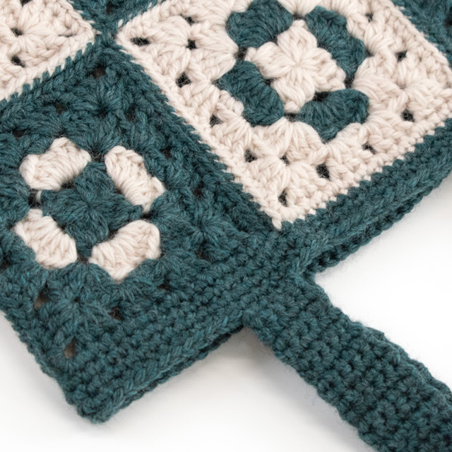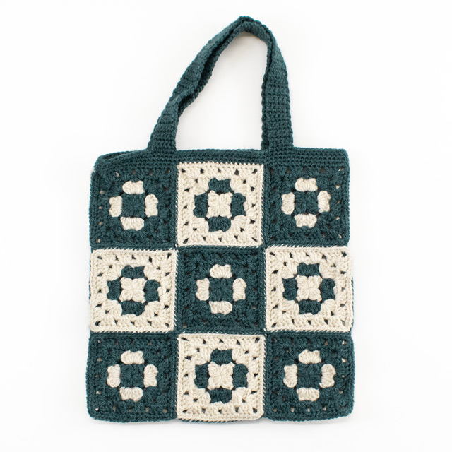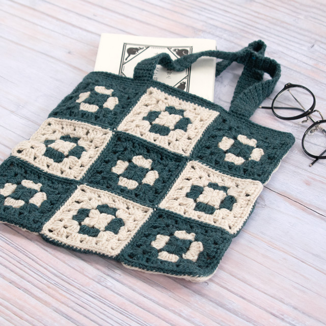 濃いグリーンとベージュの2色の「グラニーモチーフ」をつないだ、クラシックで落ち着いた雰囲気のバッグです。ハンドメイドの温かみを感じるデザインが魅力です。本や小物が入る日常使いにぴったりのサイズ感。くさり編み、細編み、長編みが編めればできるモチーフを、色を変えることによってお花が浮かび上がるように見えます。モチーフの枚数でサイズを変えることができるので、アレンジも楽しんでみてくださいね。