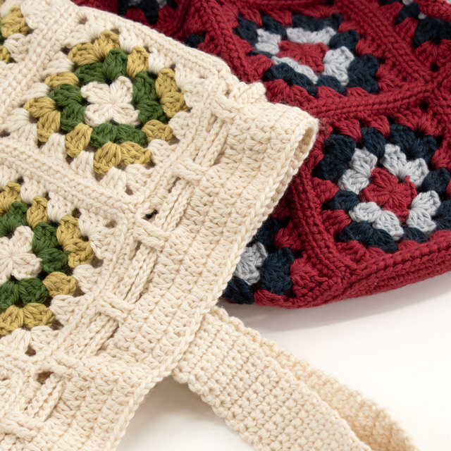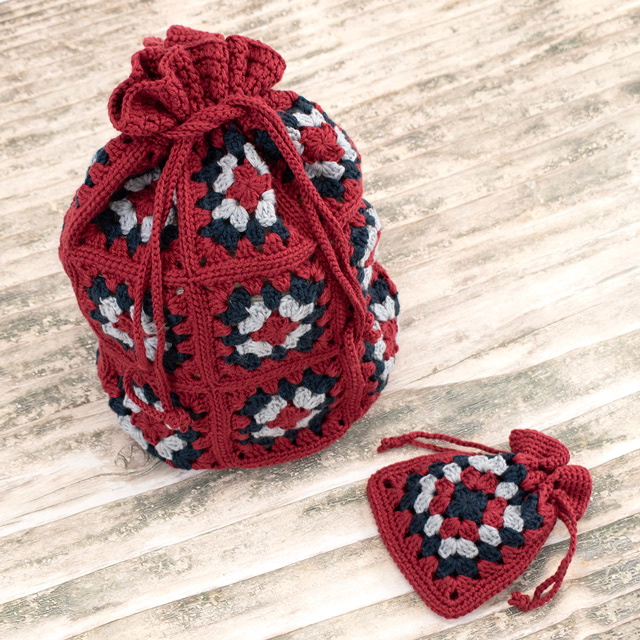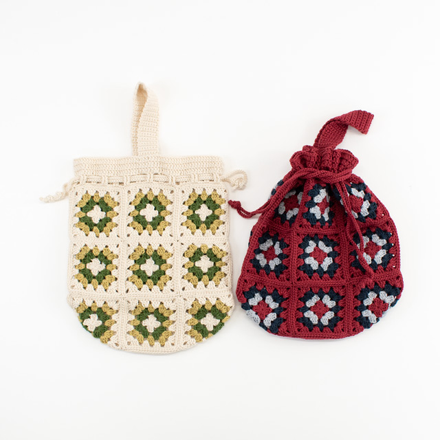 筒形の巾着タイプで厚みのあるものも入れやすい、使い勝手のよいバッグです。底は細編みで円形を編み、側面はグラニーモチーフを複数枚つなげる合わせ技!巾着タイプの使い勝手のよいバッグなのでぜひチャレンジしみてくださいね。