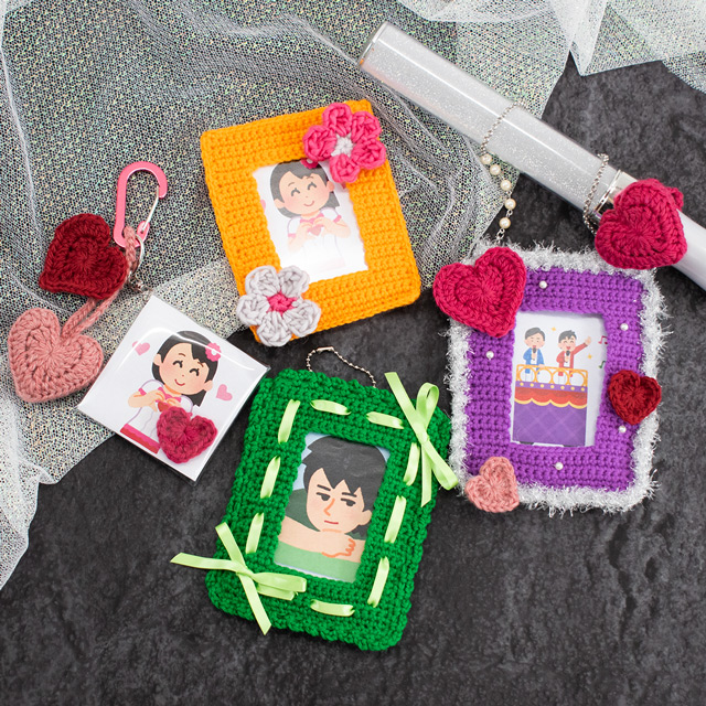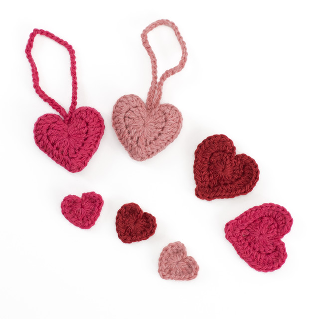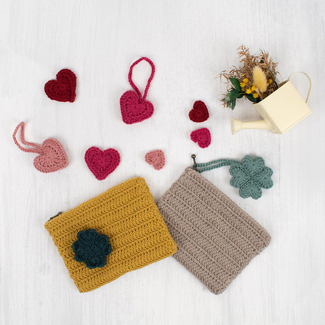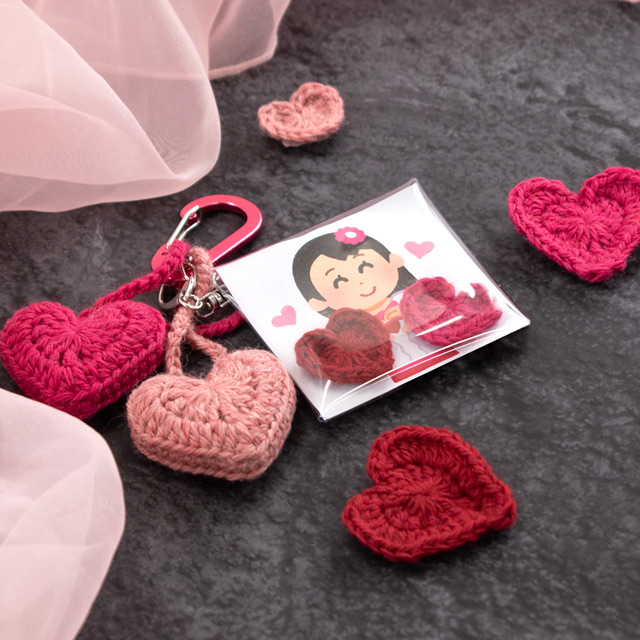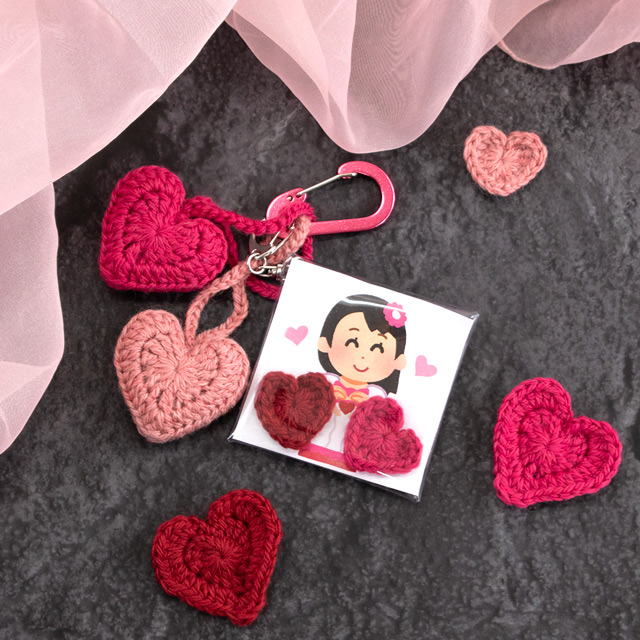ハートのぺたんこモチーフと、厚みのあるチャームです。大小のハートのモチーフはサイズや色の組み合わせが楽しめます。2枚重ねて巻きはぎし、コードをつければオーナメントやチャームになります。キーホルダーやバッグなどに、たくさん付けてもかわいいですね。