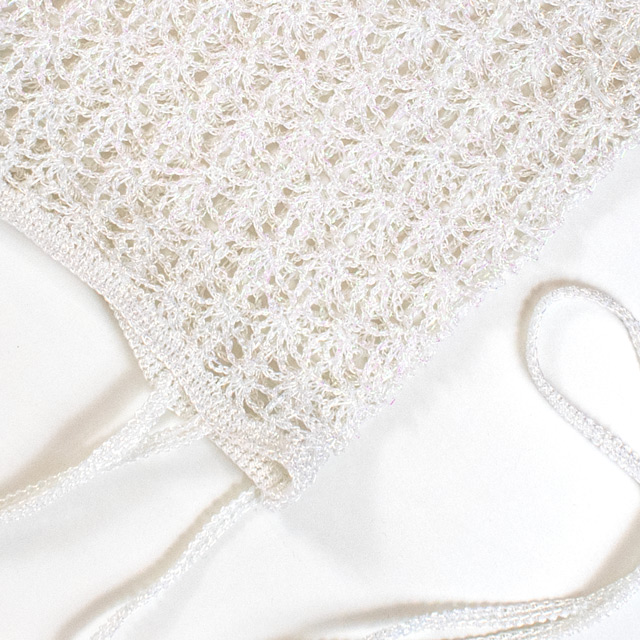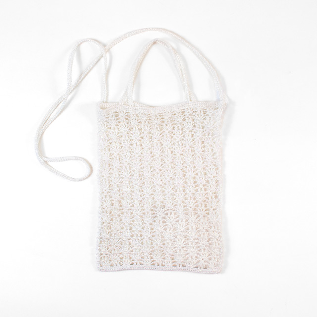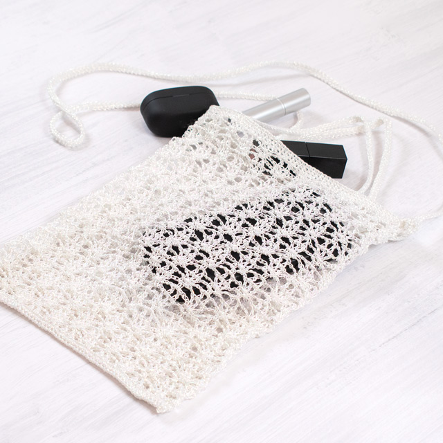オーロラ調のメタリックプレイコードを使ったバッグ。肩掛けと持ち手がついた2Wayタイプです。スマホの他に、イヤホンなどちょっとした小物も入れられるサイズです。重くなりがちな冬のファッションに合わせてもかわいいですね。初心者さんには少々難易度高めですが、挑戦してみる価値ありの可愛さです!キラキラしたメタリックプレイコードは糸が細くしっかりと硬さがあるように見えますが、編んでみると見た目より柔らかさがある糸です。