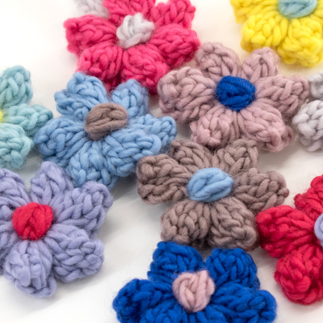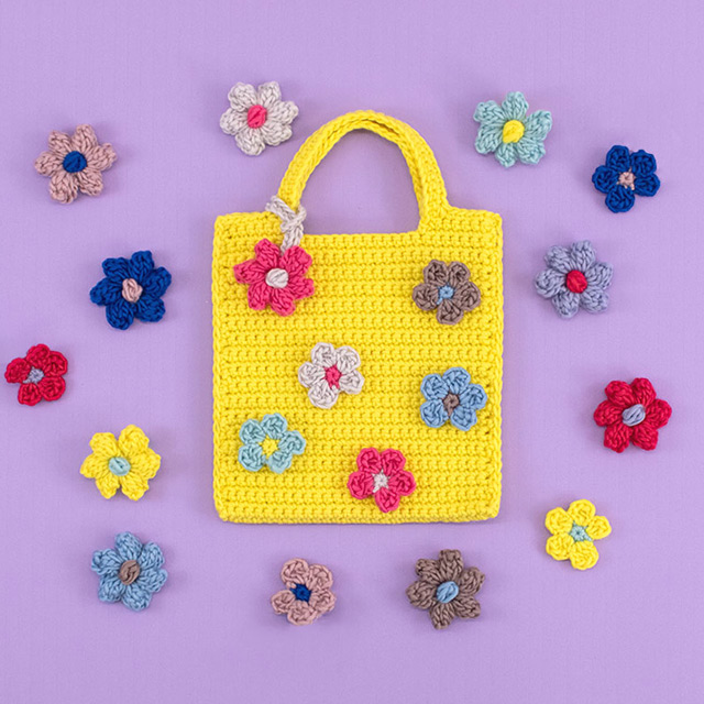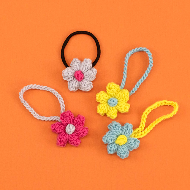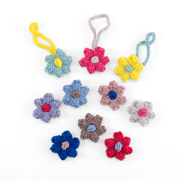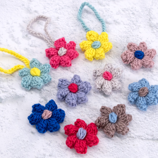 ポップル編みのぷっくりした花びらが存在感のあるお花に!ひもを付けてバッグチャームにしたり、ヘアゴムを付けてもヘアアクセにしも可愛いです。いろいろアレンジしてみてくださいね!