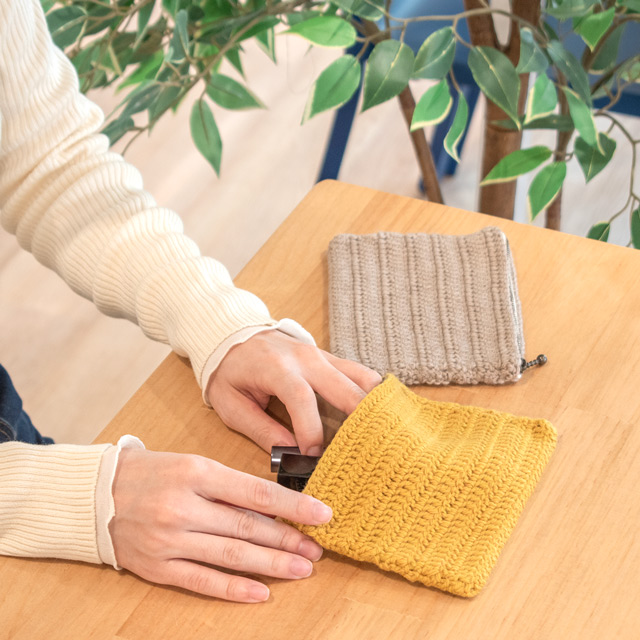 【黄色】Daily スタンダードメリノ/40g巻 色番7.ハニー使用量:27g(0.7玉) 【ベージュ】Daily スタンダードメリノ/40g巻 色番15.シャンパン使用量:27g(0.7玉)【共通】YKK メタルファスナー(3GKB DNDBL C) アンティークゴールド 止め 15cm使用量:1本フジックス ハイスパン ボタンつけ糸 20番 30m巻使用量:少量