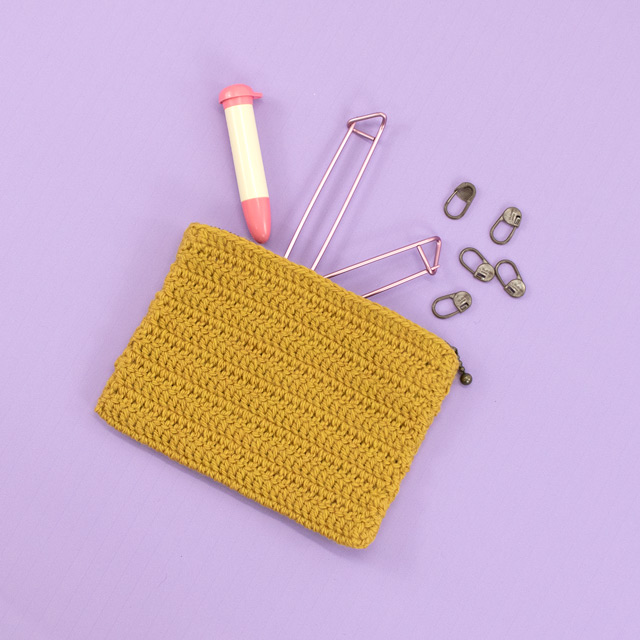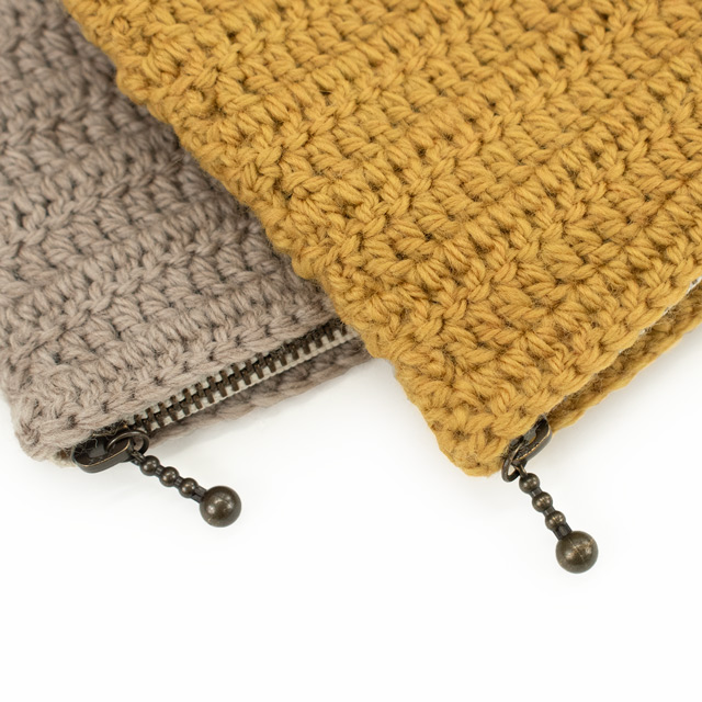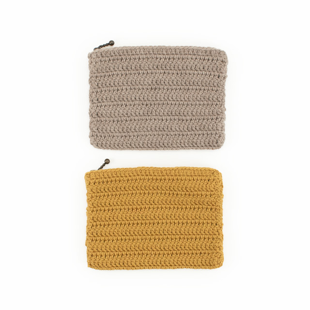 長編みでできるシンプルなぺたんこポーチ。メイクアイテムや小さな編み物ツールなどを入れるのに便利なサイズ感です。初めてかぎ針で小物を編まれる方にもおすすめ。できあがったポーチにモチーフをつけてデコレーションしてもかわいいです。