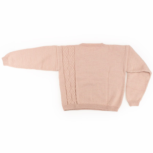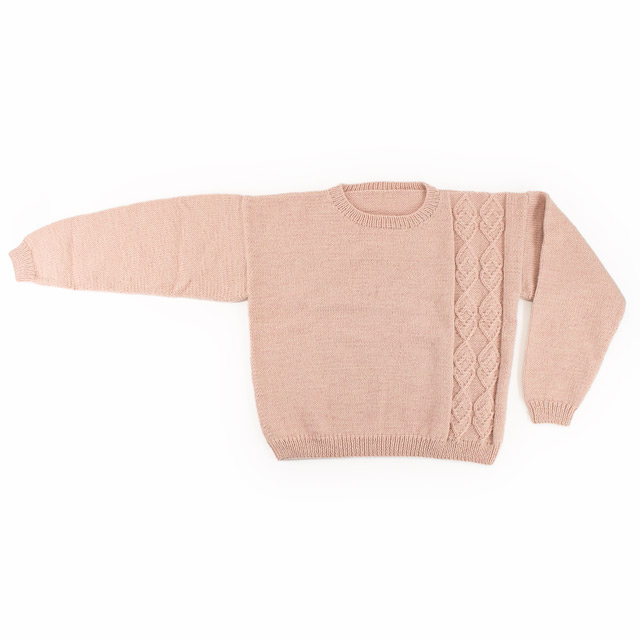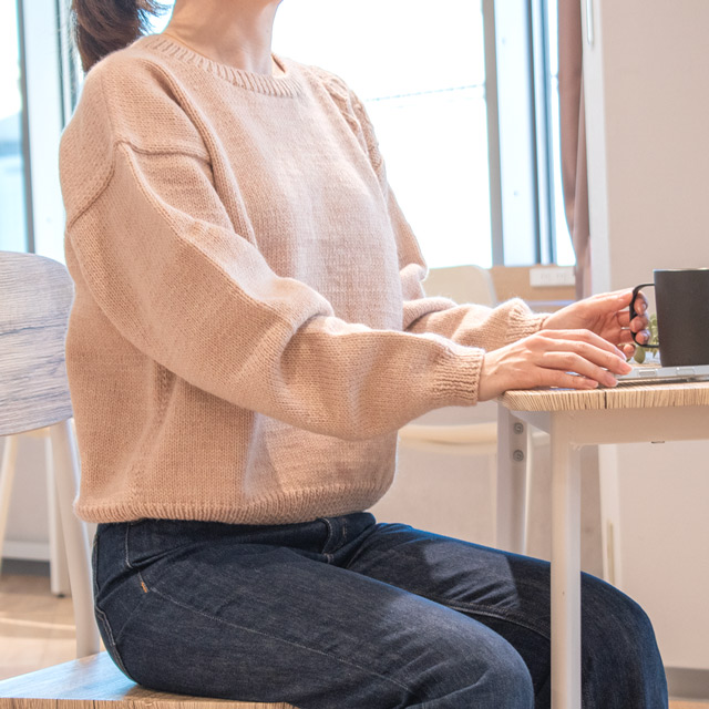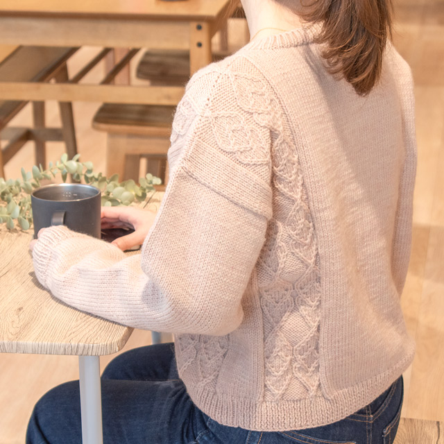 身頃の片側だけに入ったダイヤ柄がポイントのセーターです。長すぎない着丈で、パンツにもスカートにも合わせやすいデザインです。模様が入っていると難しそうに見えますが、袖ぐりは減らし目がない簡単なデザインにしているので、セーターを編むのが初めての方にもチャレンジしやすい作品です。