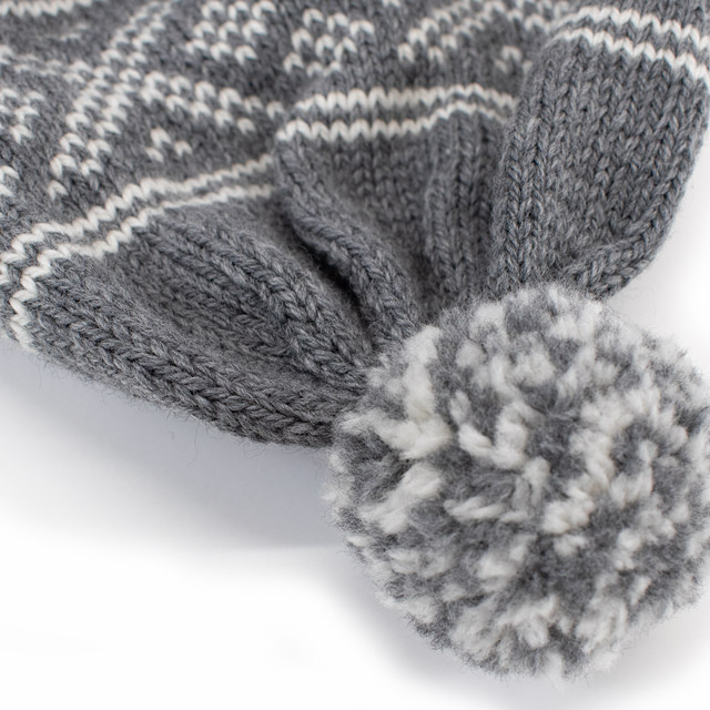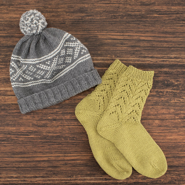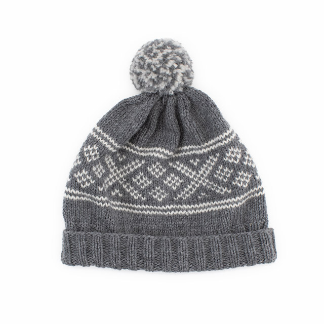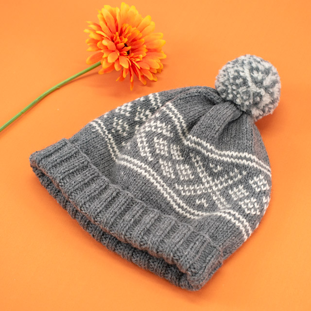 ダイヤやクロスの柄を編み込んだニット帽。ノルディック調の柄が、ノスタルジックで温かみのある雰囲気を演出します。一見難しそうな編み込み模様も、輪で編むことによって表面だけ見て編めるので、配色の糸替えがスムーズにできます。編み込みにチャレンジしてみたい!という方におすすめです。