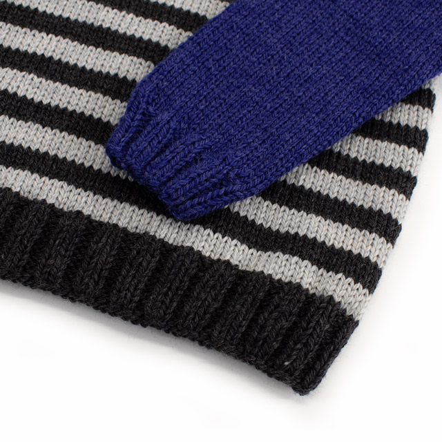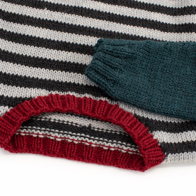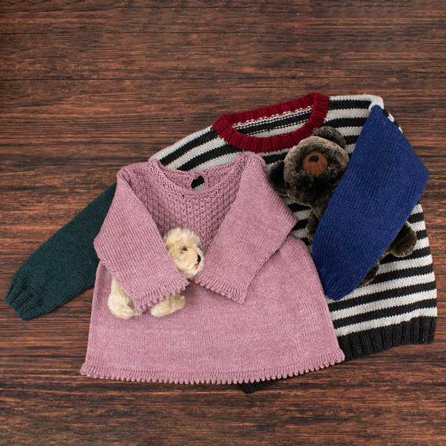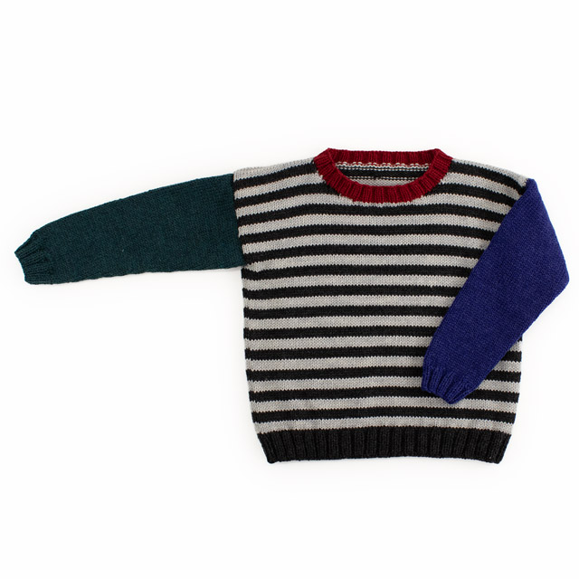 多色使いがかわいいキッズセーターです。お子様の好みにあわせて色を替えたり単色で編んでも!メリヤス編みで規則的に色を変え、ボーダー柄にしています。袖ぐりの減らし目をなくし、まっすぐ編む簡単なデザインなので、ウェアを編むのが初めての方にもおすすめです。