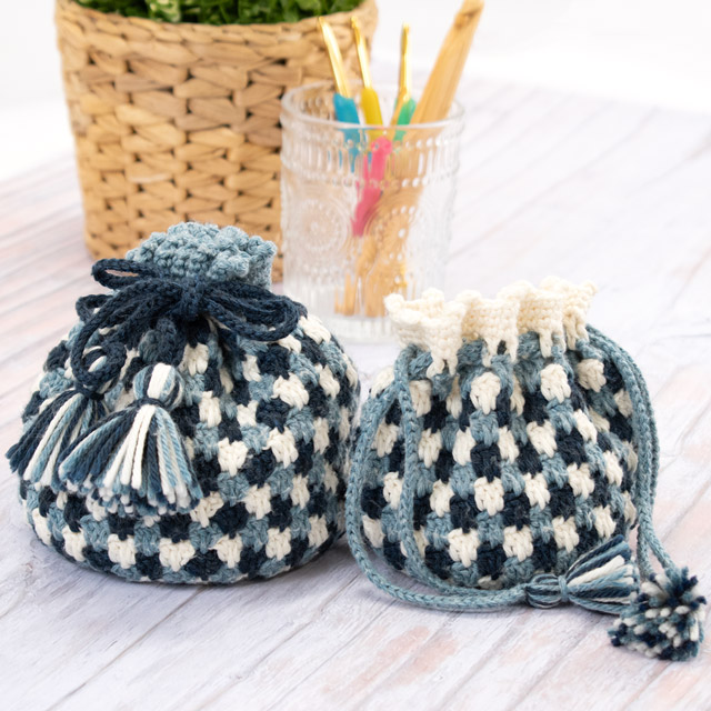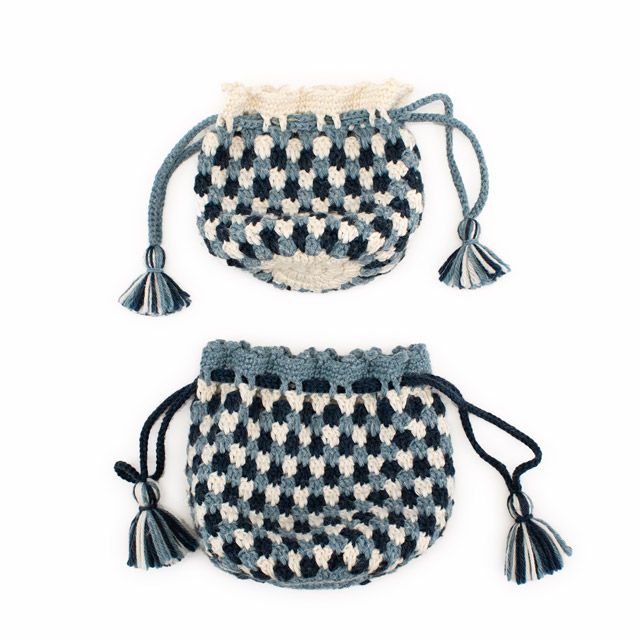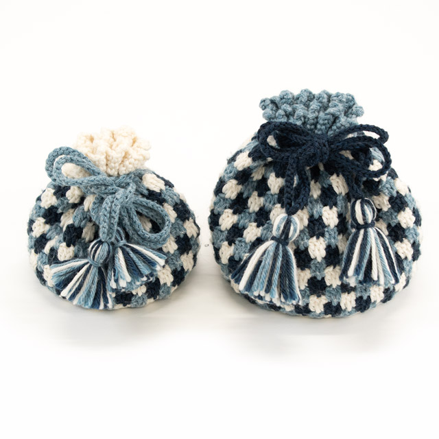ころんとしたフォルムがかわいい、かぎ針編み巾着です。紐先のタッセルもデザインのポイントです。アクセサリーやメイクアイテム、飴などの小さな物はもちろん、ぬいぐるみやお人形を入れても!段ごとに色を替えているので少し複雑そうに見えますが、長編み、細編み、くさり編みの基本の編み方で編めるので、かぎ針はじめてさんでもチャレンジしやすい作品です。大小2サイズの編み図が記載されているので、ぜひサイズ違いで編んでみてください。