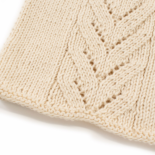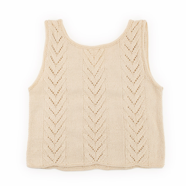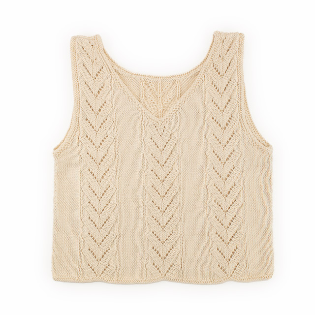 1枚でさらりと着たり、レイヤードスタイルを楽しむこともできる万能キャミソール。前は浅めのVネック、後は広めの衿ぐりと、雰囲気を変えて前後で着用できます。繰り返しの透かし模様はリズムよく編めて、仕上がりも軽やかに。