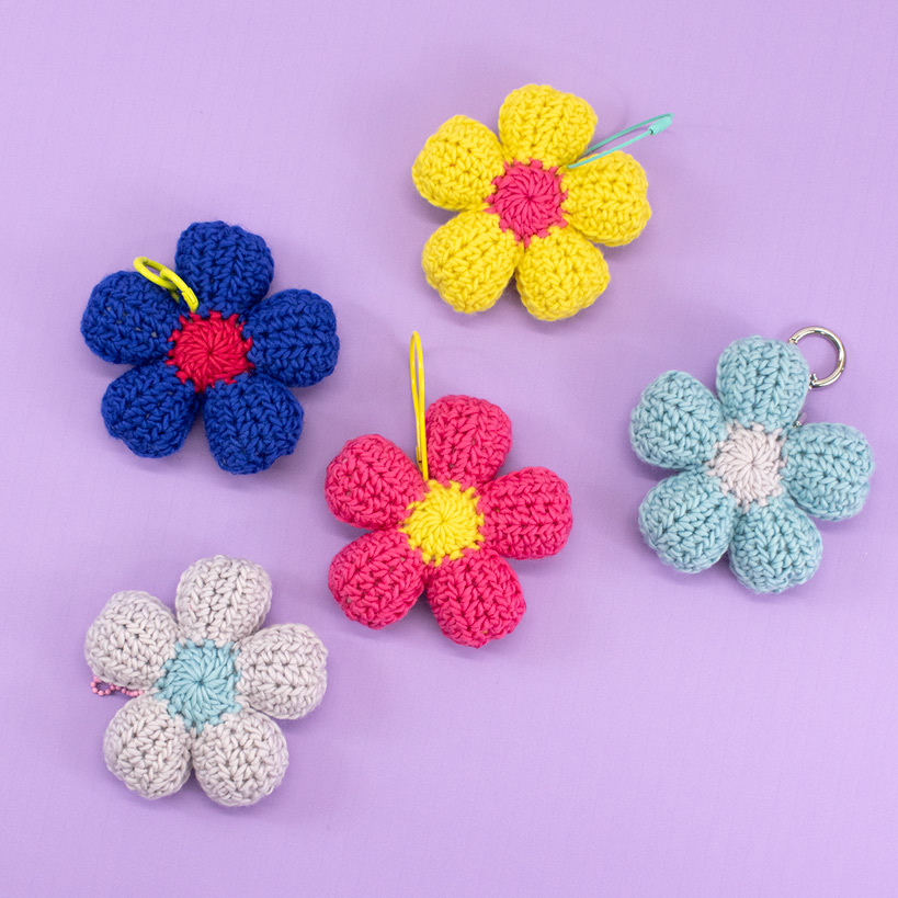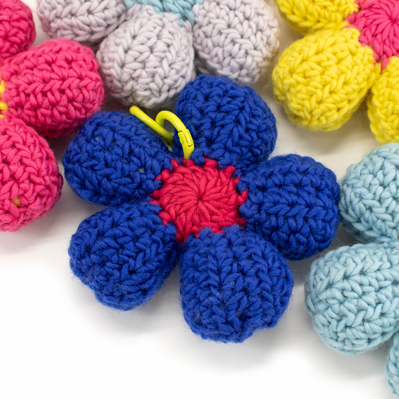 わたを詰めてぷっくり立体的に仕上げた、大きなお花のチャーム。バッグやスマホにつけると存在感抜群!細編みや長編みなどのかぎ針編みの基本的な編み方で編むので、かぎ針はじめてさんにもおすすめです。色の組み合わせも楽しんで編んでみてくださいね。