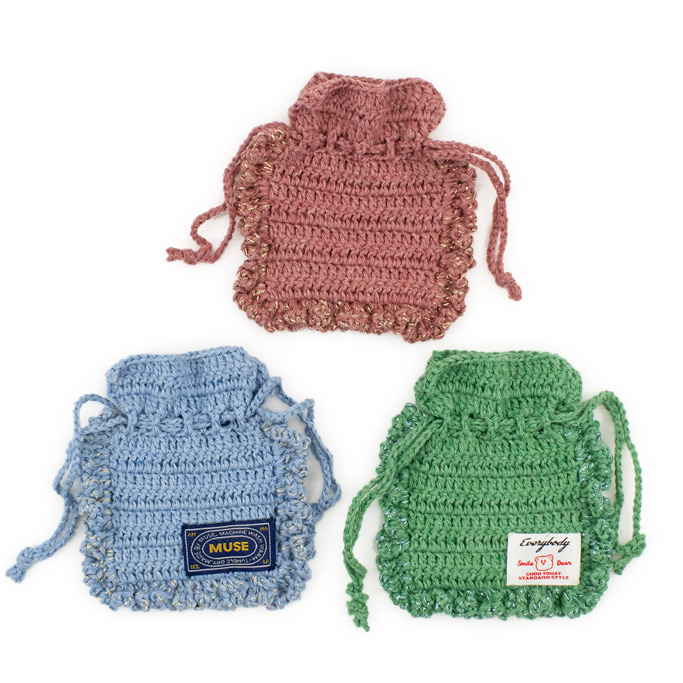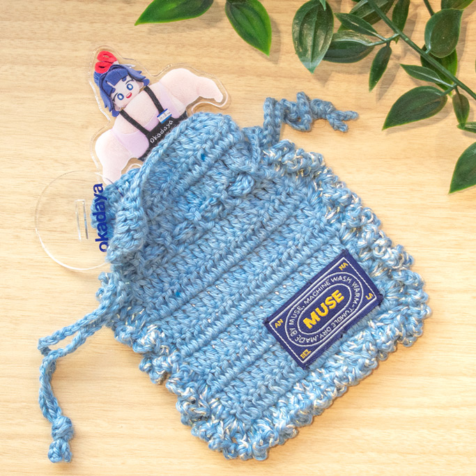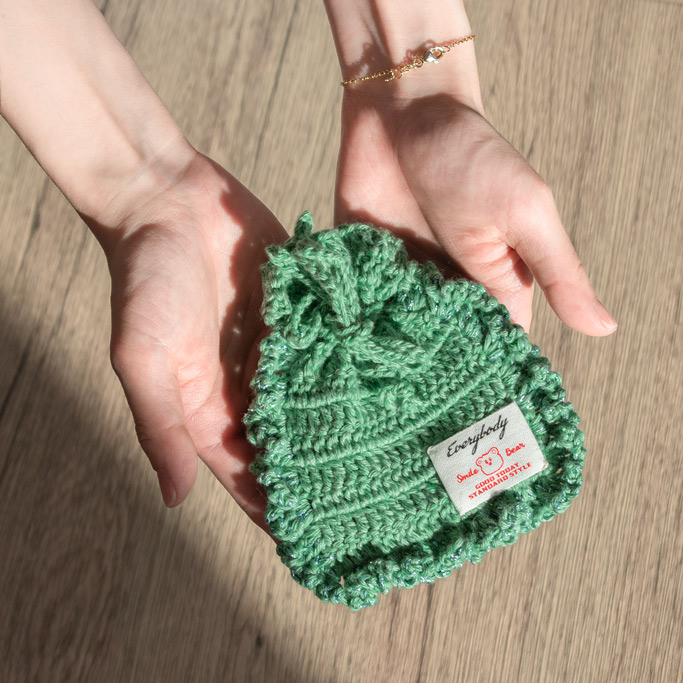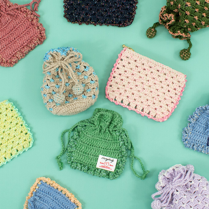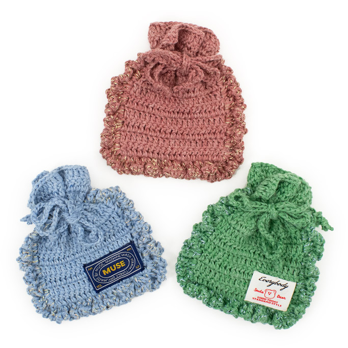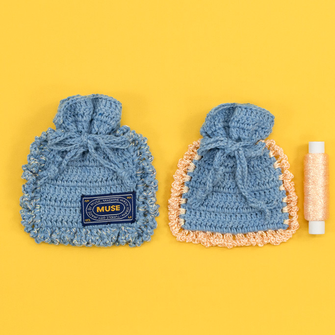 キラキラのフリルがかわいい、手の平サイズの小さなきんちゃくです。フリル部分にだけラメ糸を引き揃えキラキラ感を出しているのもポイント。長編みの本体を2枚編み、2枚の本体をとじながらフリルを編んで仕上げる簡単デザインなので、初めてかぎ針に挑戦したい方におすすめです。フリルをラメ糸のみで編んだり、お好みでタグをつけるのも◎。お気に入りの組み合わせで編んでみてくださいね。