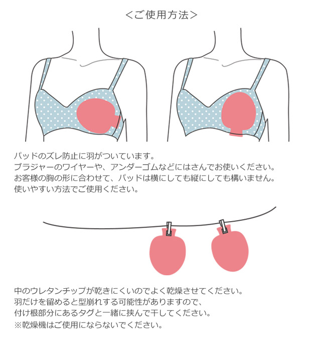 ●パットのズレ防止に、羽をブラジャーのワイヤーや、アンダーゴムなどに挟んでお使いください。