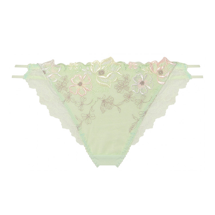 サイドはループ(紐)、フロント部分にはヴェールを掛けたようなレースを使用したデザインです。