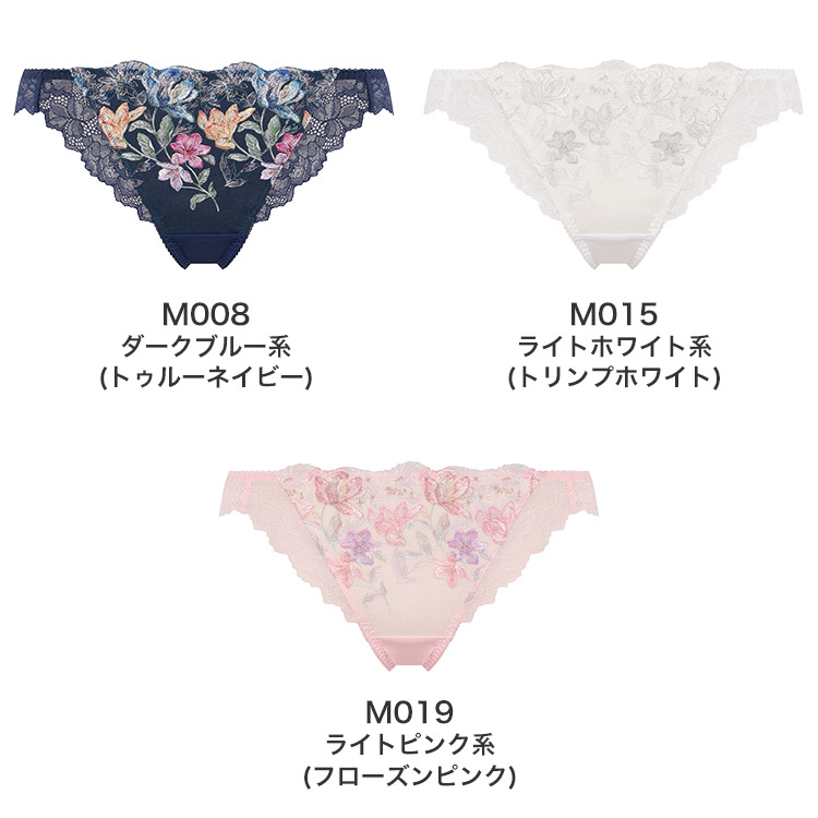 M008 ダークブルー系(トゥルーネイビー)、M015 ライトホワイト系(トリンプホワイト)、M019 ライトピンク系(フローズンピンク)