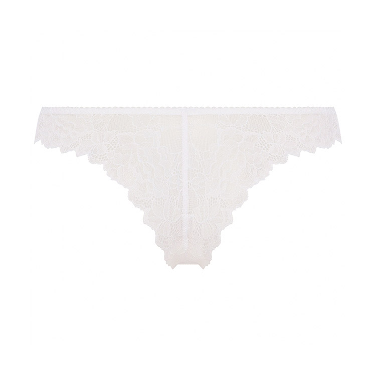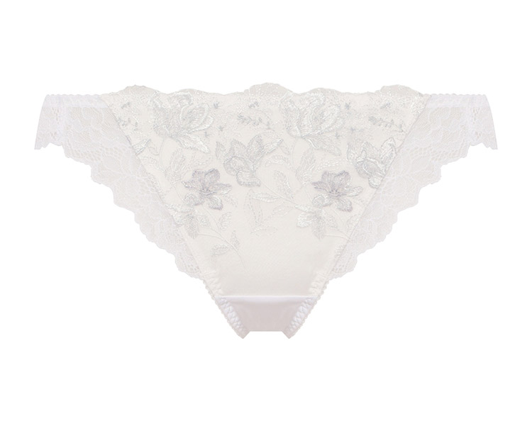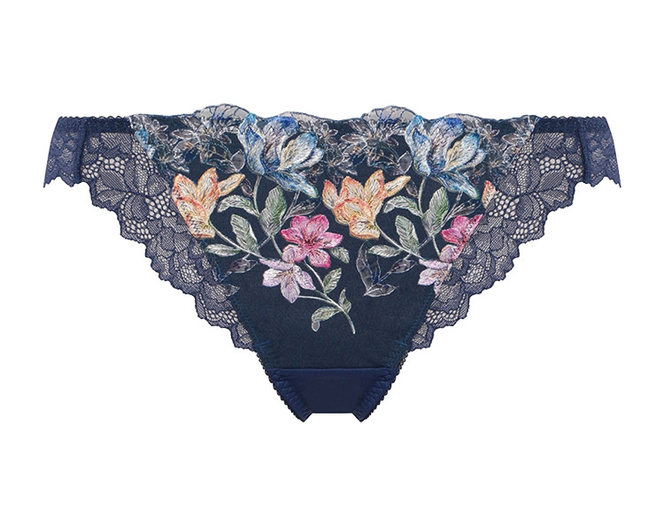 ロマンチックなプリントエンブレースをフロントにあしらい、フロント脚口とヒップ部分にストレッチレースを使用したプレミアム感あふれる華やかなデザインです。