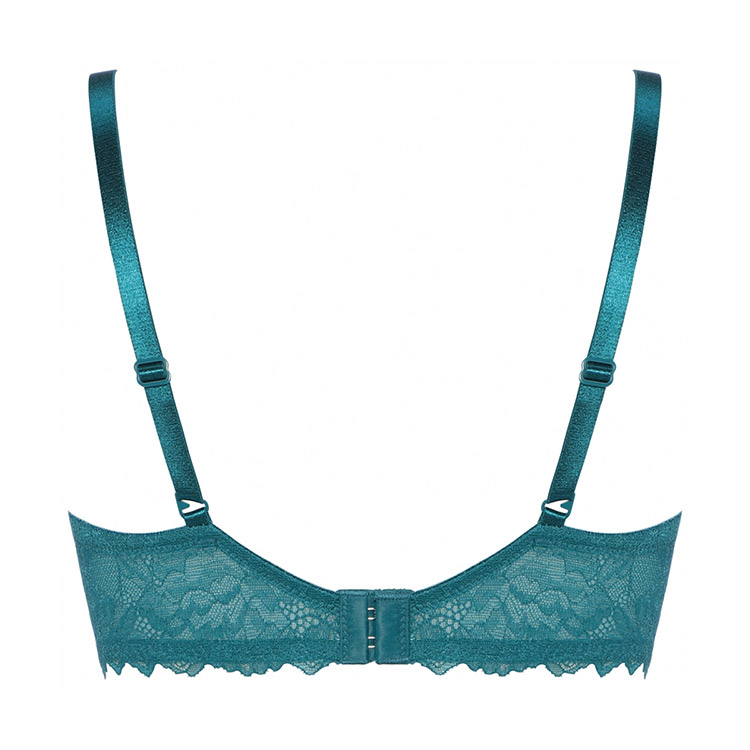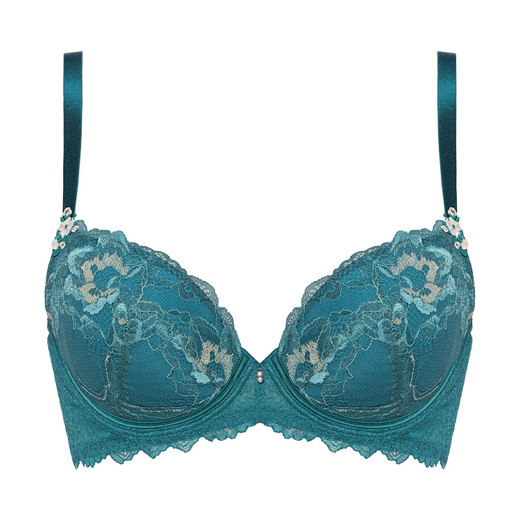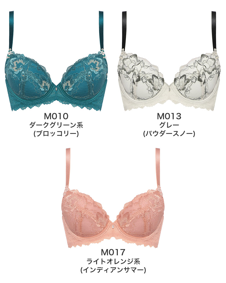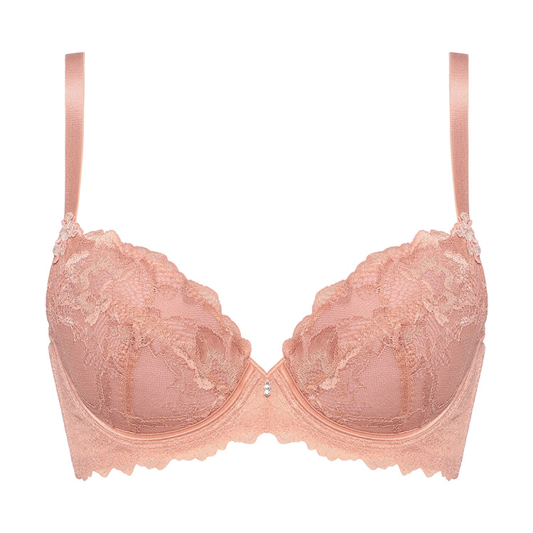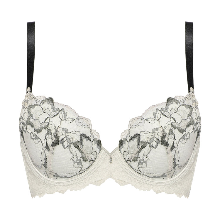 カップと背中にストレッチレースを使用し、ストラップの付け根にモチーフを使用したプレミアムらしい上品なデザインです。