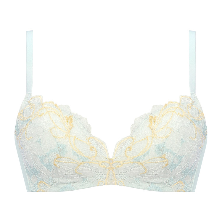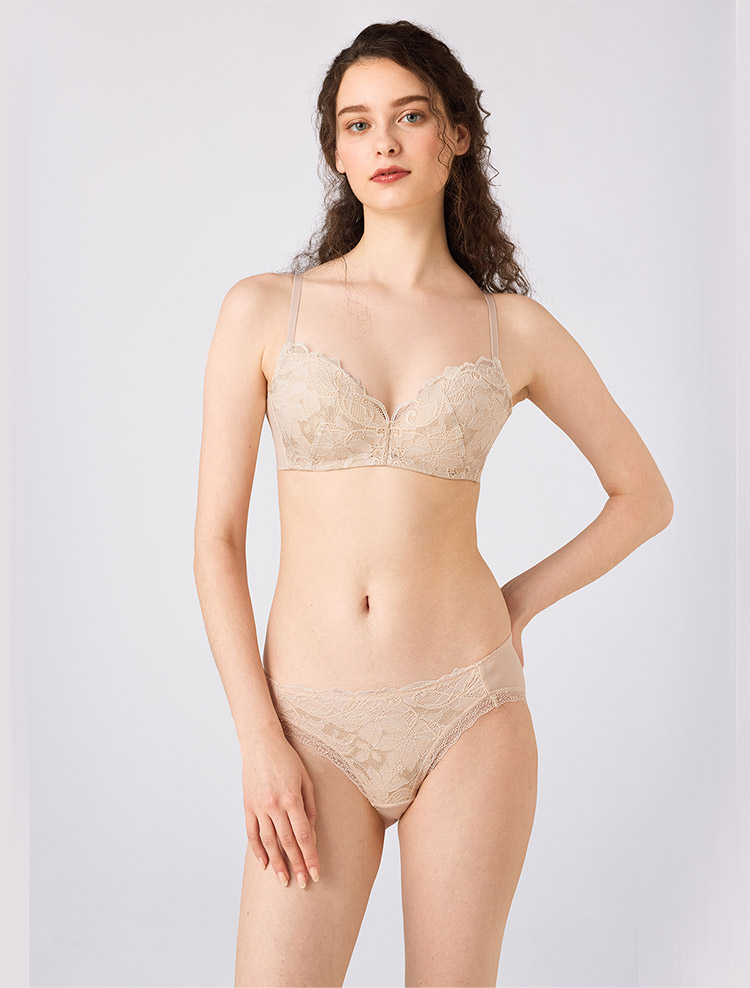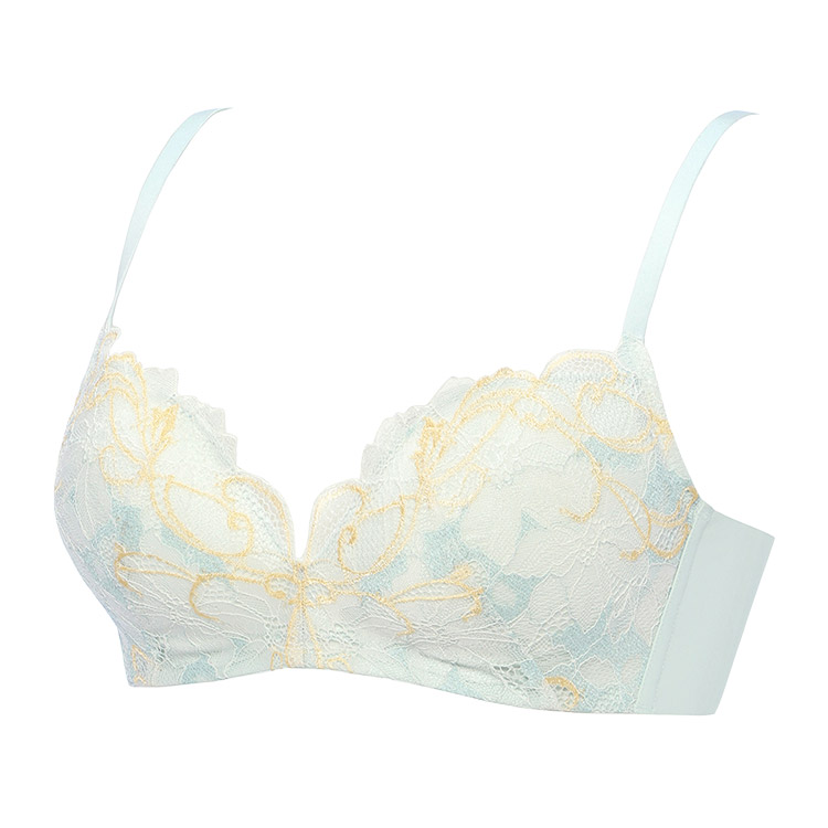 クレマチスの花をモチーフにした編みレースをバスト部分に使用したノンワイヤーだけどきれいなバストシルエットに見えるデザインのブラジャーです。