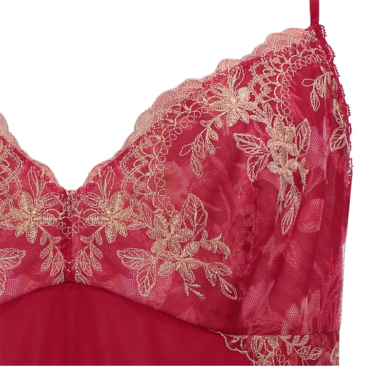 ナイトジャスミンの花をメインに幾何学模様を組み合わせ、花の中心の星がポイントの刺しゅうレース、ナイトジャスミンの葉っぱをイメージしたボタニカルプリントを組み合わせたレースを胸元に使用しています。