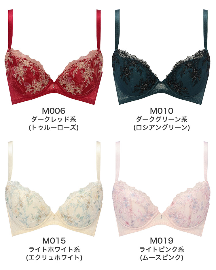 M006 ダークレッド系(トゥルーローズ)、M010 ダークグリーン系(ロシアングリーン)、M015 ライトホワイト系(エクリュホワイト)、M019 ライトピンク系(ムースピンク)