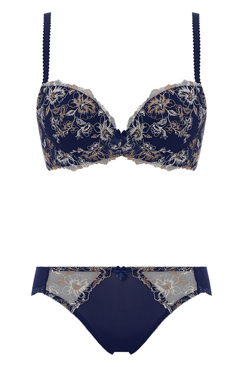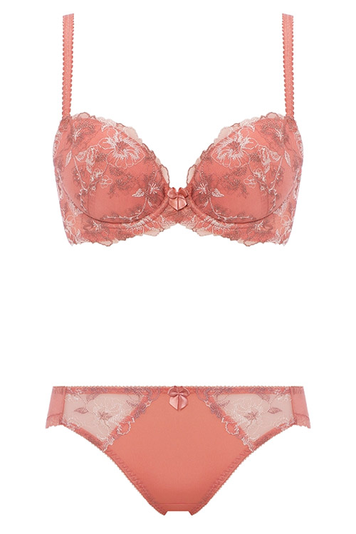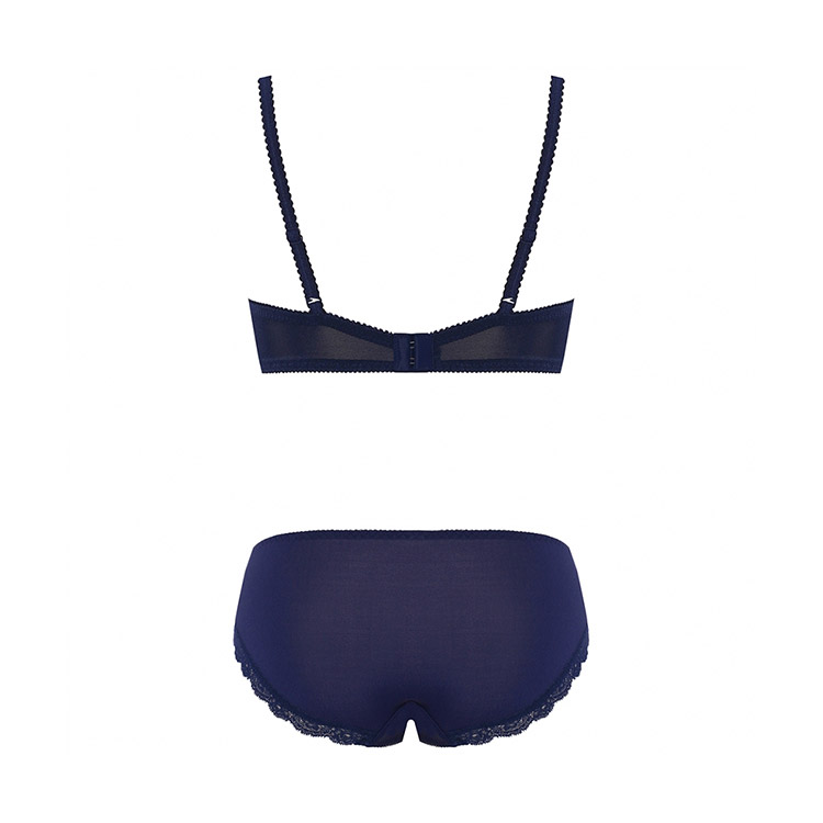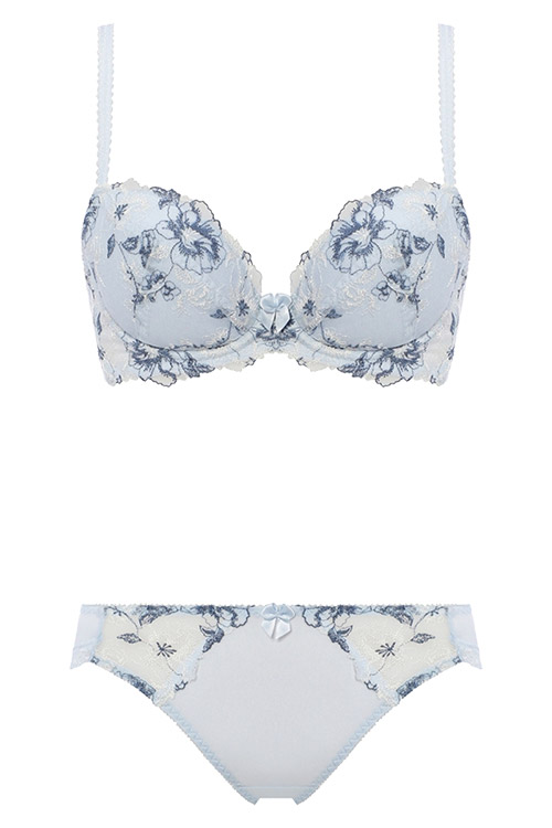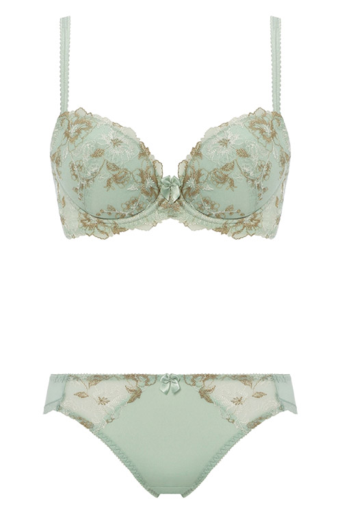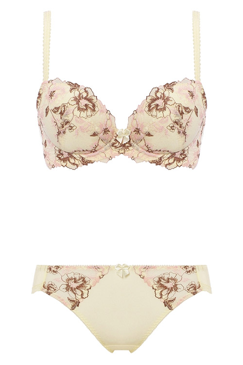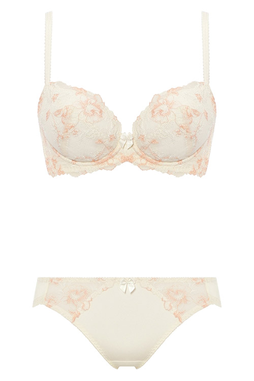 ブラジャーとセットアップのショーツ。透け感のある両サイドの美しい刺しゅうレースが上品でエレガント。