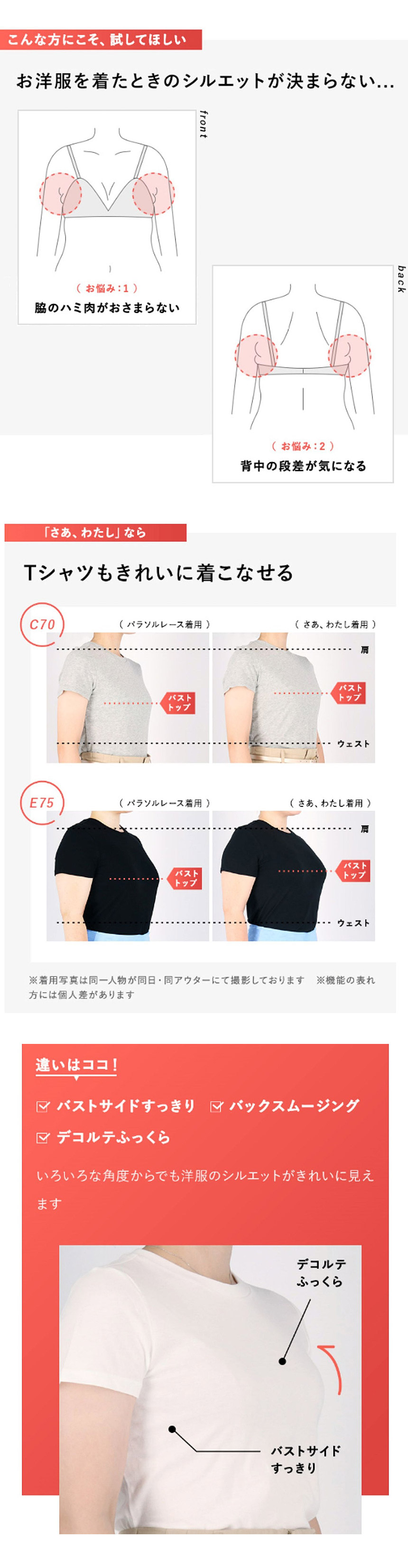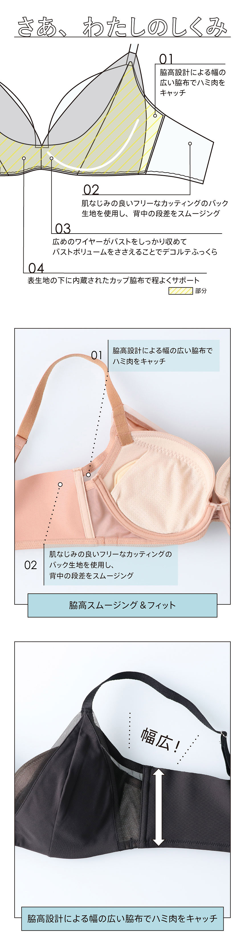 脇高設計による幅の広い脇布でハミ肉をキャッチし、しっかり収めることでバストサイドのラインをすっきりととのえる。